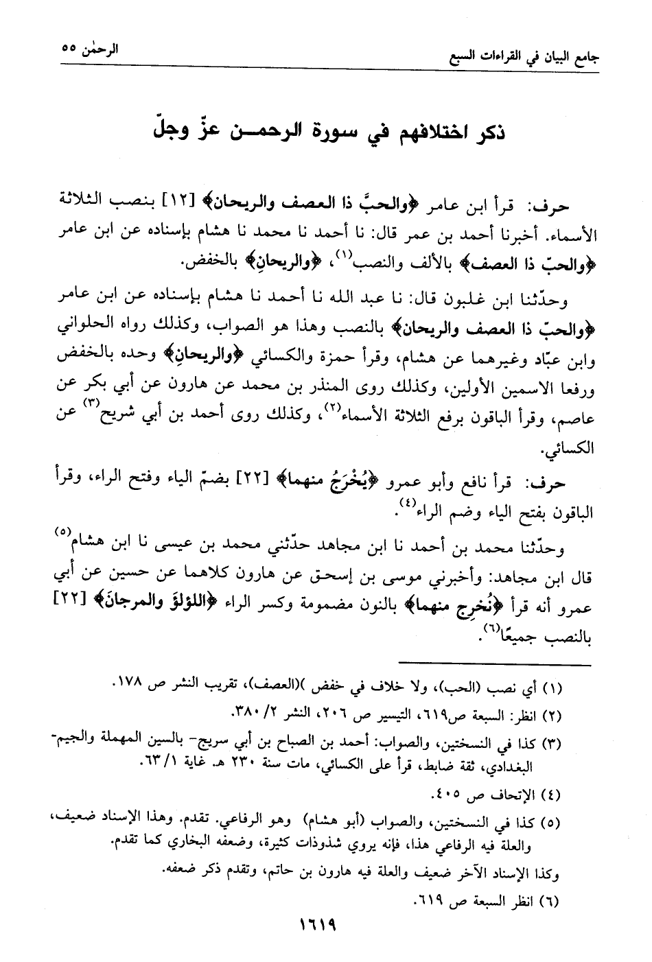وحدّثنا ابن غلبون قال: نا عبد الله نا أحمد نا هشام بإسناده عن ابن عامر والحبّ ذا العصف والريحان بالنصب وهذا هو الصواب، وكذلك رواه الحلواني وابن عبّاد وغيرهما عن هشام، وقرأ حمزة والكسائي والريحان وحده بالخفض ورفعا الاسمين الأولين، وكذلك روى المنذر بن محمد عن هارون عن أبي بكر عن عاصم، وقرأ الباقون برفع الثلاثة الأسماء «2»، وكذلك روى أحمد بن أبي شريح «3» عن الكسائي.