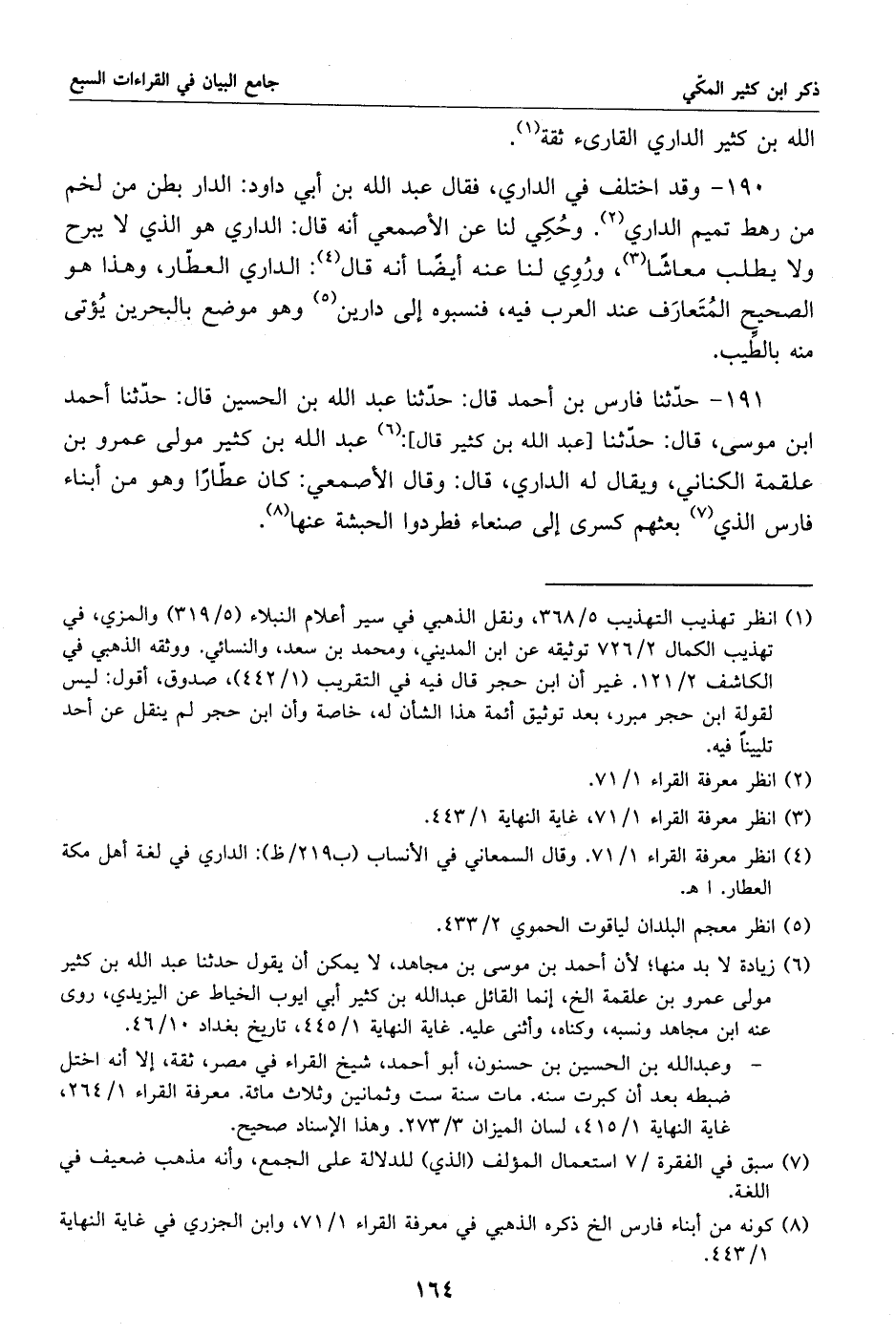 (4) انظر معرفة القراء 1/ 71. وقال السمعاني في الأنساب (ب 219/ ظ): الداري في لغة أهل مكة العطار. اهـ.