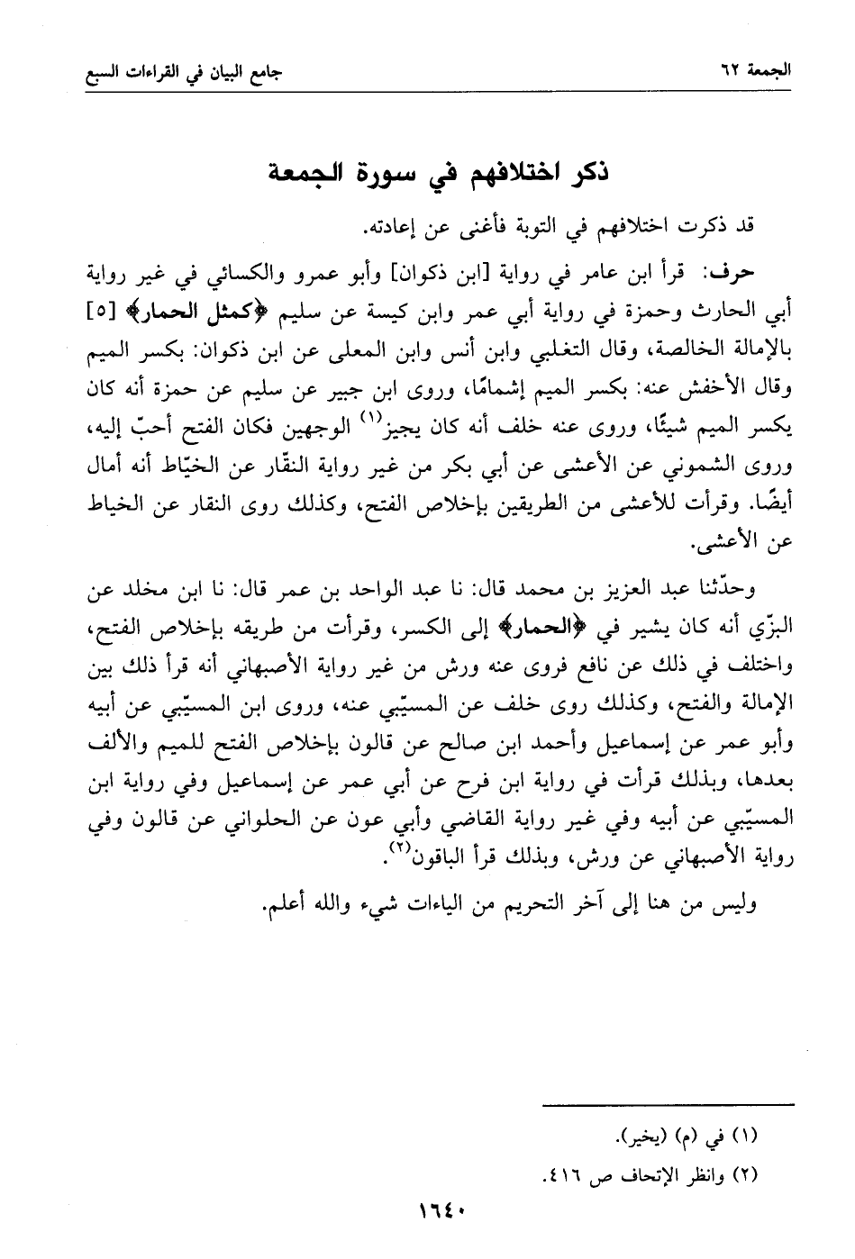 وحدّثنا عبد العزيز بن محمد قال: نا عبد الواحد بن عمر قال: نا ابن مخلد عن البزّي أنه كان يشير في الحمار إلى الكسر، وقرأت من طريقه بإخلاص الفتح، واختلف في ذلك عن نافع فروى عنه ورش من غير رواية الأصبهاني أنه قرأ ذلك بين الإمالة والفتح، وكذلك روى خلف عن المسيّبي عنه، وروى ابن المسيّبي عن أبيه وأبو عمر عن إسماعيل وأحمد ابن صالح عن قالون بإخلاص الفتح للميم والألف بعدها، وبذلك قرأت في رواية ابن فرح عن أبي عمر عن إسماعيل وفي رواية ابن المسيّبي عن أبيه وفي غير رواية القاضي وأبي عون عن الحلواني عن قالون وفي رواية الأصبهاني عن ورش، وبذلك قرأ الباقون «2».