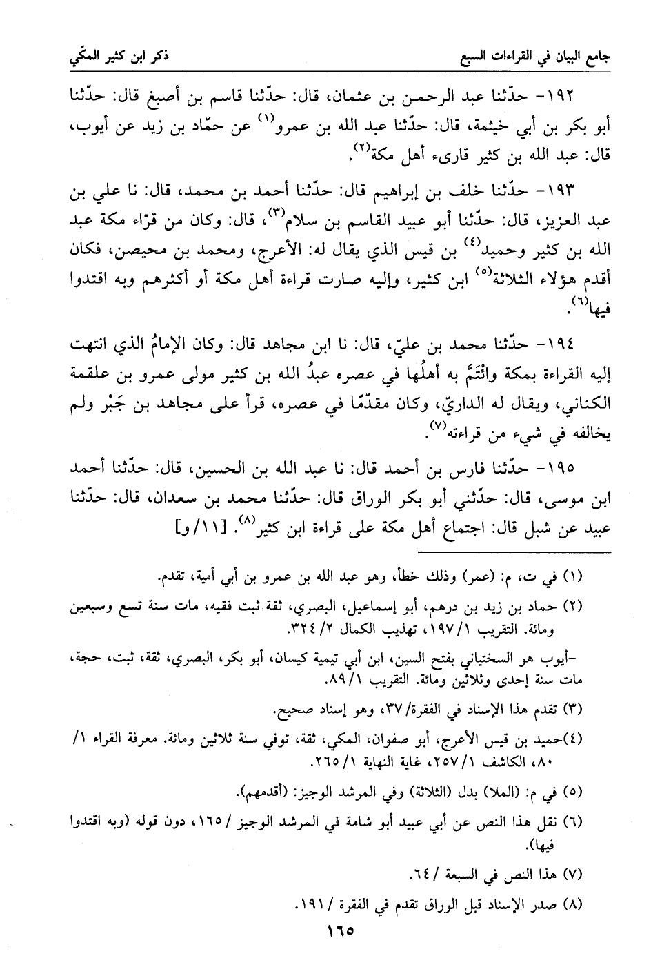 192 - حدّثنا عبد الرحمن بن عثمان، قال: حدّثنا قاسم بن أصبغ قال: حدّثنا أبو بكر بن أبي خيثمة، قال: حدّثنا عبد الله بن عمرو «1» عن حمّاد بن زيد عن أيوب، قال: عبد الله بن كثير قارئ أهل مكة «2».