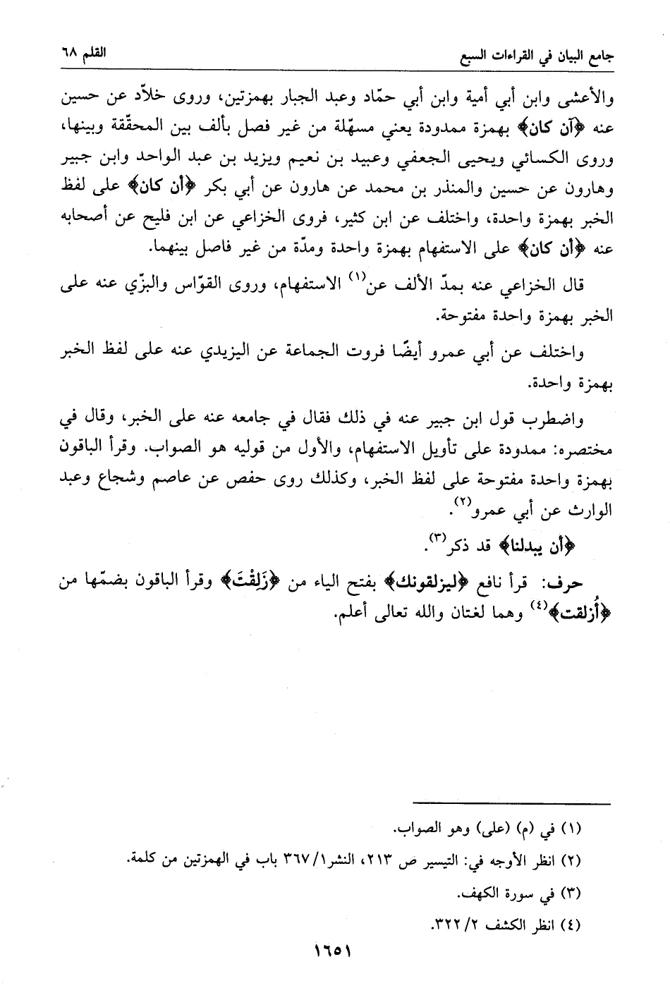 والأعشى وابن أبي أمية وابن أبي حمّاد وعبد الجبار بهمزتين، وروى خلّاد عن حسين عنه آن كان بهمزة ممدودة يعني مسهّلة من غير فصل بألف بين المحقّقة وبينها، وروى الكسائي ويحيى الجعفي وعبيد بن نعيم ويزيد بن عبد الواحد وابن جبير وهارون عن حسين والمنذر بن محمد عن هارون عن أبي بكر أن كان على لفظ الخبر بهمزة واحدة، واختلف عن ابن كثير، فروى الخزاعي عن ابن فليح عن أصحابه عنه أن كان على الاستفهام بهمزة واحدة ومدّة من غير فاصل بينهما.