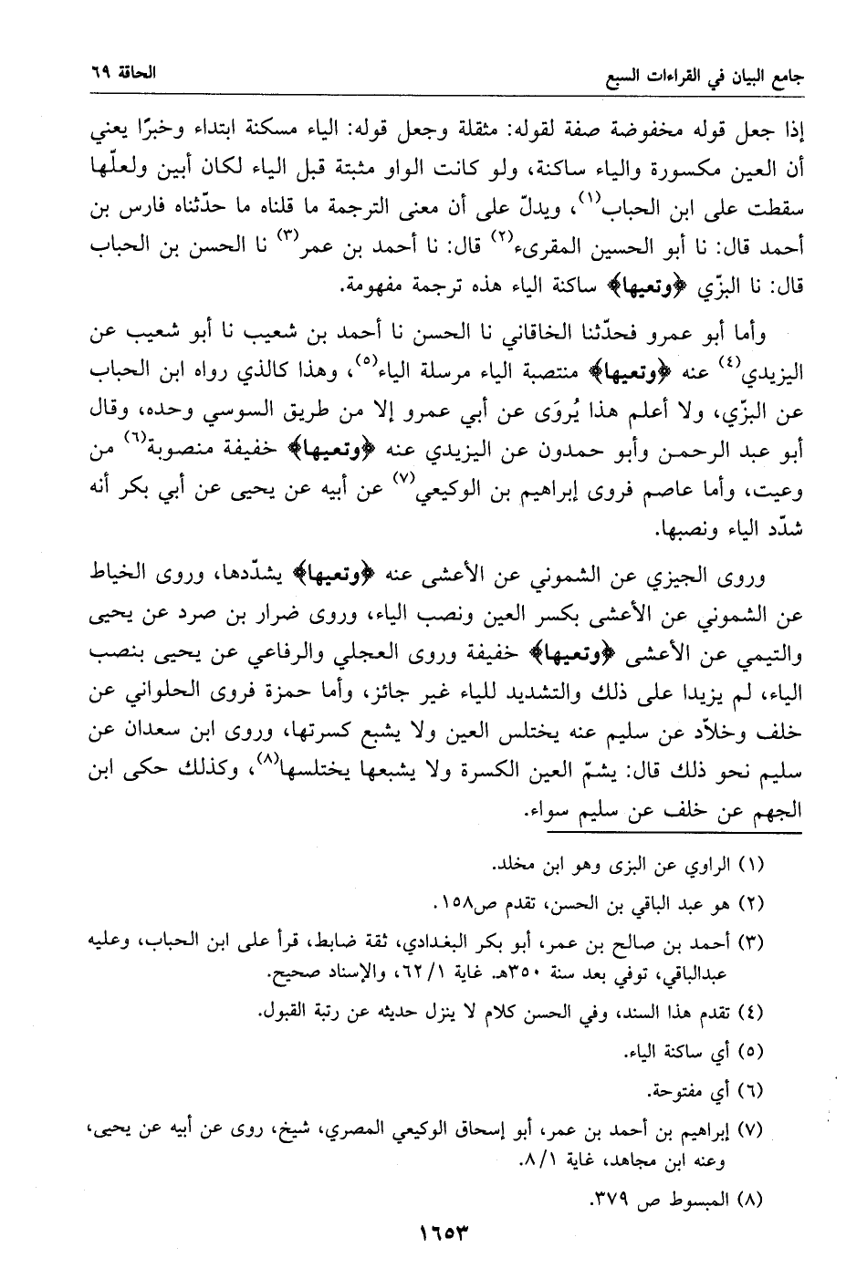 وروى الجيزي عن الشموني عن الأعشى عنه وتعيها يشدّدها، وروى الخياط عن الشموني عن الأعشى بكسر العين ونصب الياء، وروى ضرار بن صرد عن يحيى والتيمي عن الأعشى وتعيها خفيفة وروى العجلي والرفاعي عن يحيى بنصب الياء، لم يزيدا على ذلك والتشديد للياء غير جائز، وأما حمزة فروى الحلواني عن خلف وخلّاد عن سليم عنه يختلس العين ولا يشبع كسرتها، وروى ابن سعدان عن سليم نحو ذلك قال: يشمّ العين الكسرة ولا يشبعها يختلسها «8»، وكذلك حكى ابن الجهم عن خلف عن سليم سواء.