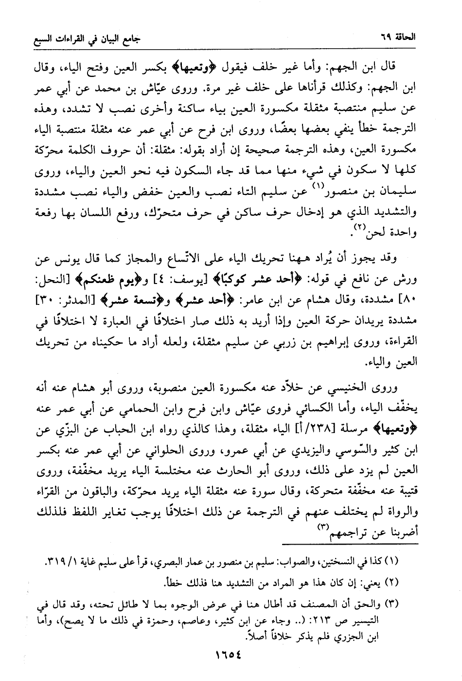 وروى الخنيسي عن خلّاد عنه مكسورة العين منصوبة، وروى أبو هشام عنه أنه يخفّف الياء، وأما الكسائي فروى عيّاش وابن فرح وابن الحمامي عن أبي عمر عنه وتعيها مرسلة [238/ أ] الياء مثقلة، وهذا كالذي رواه ابن الحباب عن البزّي عن ابن كثير والسّوسي واليزيدي عن أبي عمرو، وروى الحلواني عن أبي عمر عنه بكسر العين لم يزد على ذلك، وروى أبو الحارث عنه مختلسة الياء يريد مخفّفة، وروى قتيبة عنه مخفّفة متحركة، وقال سورة عنه مثقلة الياء يريد محرّكة، والباقون من القرّاء والرواة لم يختلف عنهم في الترجمة عن ذلك اختلافا يوجب تغاير اللفظ فلذلك أضربنا عن تراجمهم «3»