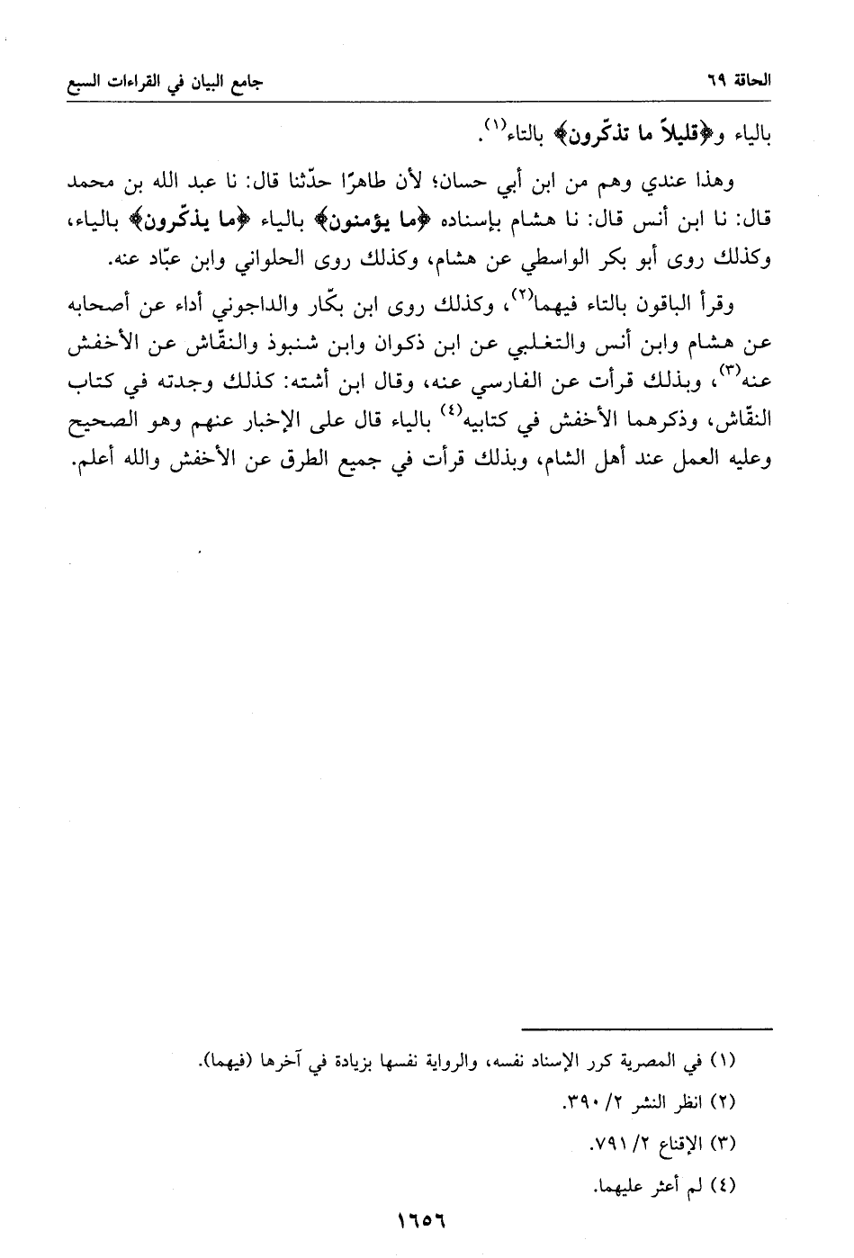 وهذا عندي وهم من ابن أبي حسان؛ لأن طاهرا حدّثنا قال: نا عبد الله بن محمد قال: نا ابن أنس قال: نا هشام بإسناده ما يؤمنون بالياء ما يذكّرون بالياء، وكذلك روى أبو بكر الواسطي عن هشام، وكذلك روى الحلواني وابن عبّاد عنه.