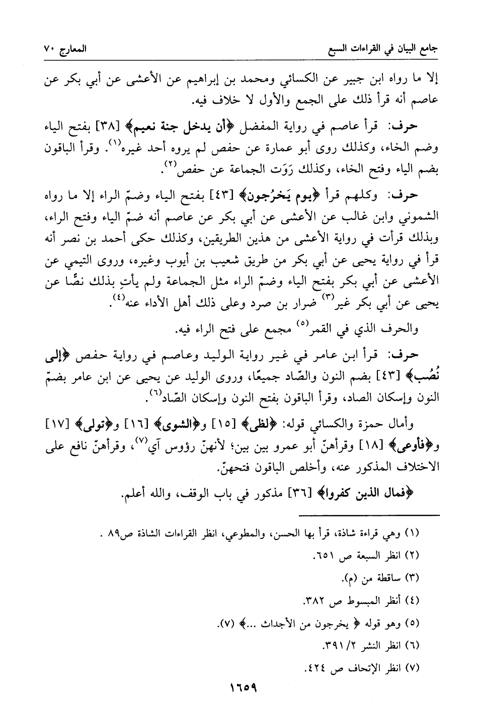 وكلهم قرأ يوم يخرجون [43] بفتح الياء وضمّ الراء إلا ما رواه الشموني وابن غالب عن الأعشى عن أبي بكر عن عاصم أنه ضمّ الياء وفتح الراء، وبذلك قرأت في رواية الأعشى من هذين الطريقين، وكذلك حكى أحمد بن نصر أنه قرأ في رواية يحيى عن أبي بكر من طريق شعيب بن أيوب وغيره، وروى التيمي عن الأعشى عن أبي بكر