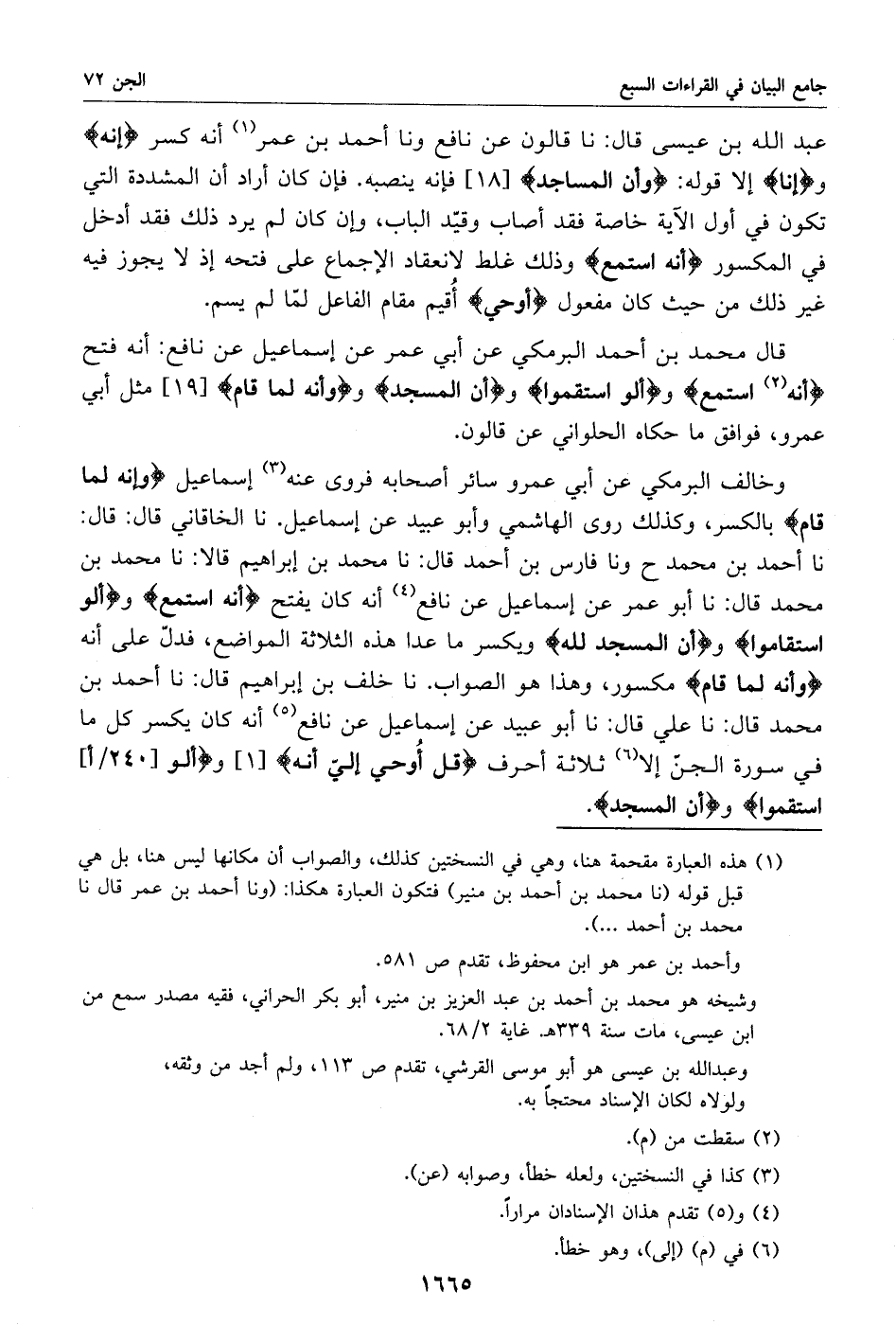 نا أحمد بن محمد ح ونا فارس بن أحمد قال: نا محمد بن إبراهيم قالا: نا محمد بن محمد قال: نا أبو عمر عن إسماعيل عن نافع «4» أنه كان يفتح أنه استمع وألو استقاموا وأن المسجد لله ويكسر ما عدا هذه الثلاثة المواضع، فدلّ على أنه وأنه لما قام مكسور، وهذا هو الصواب. نا خلف بن إبراهيم قال: نا أحمد بن محمد قال: نا علي قال: نا أبو عبيد عن إسماعيل عن نافع «5» أنه كان يكسر كل ما في سورة الجنّ إلا «6» ثلاثة أحرف قل أوحي إليّ أنه [1] وألو [240/ أ] استقموا وأن المسجد.