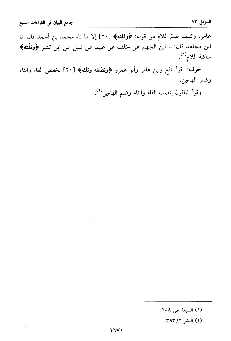 عامر، وكلهم ضمّ اللام من قوله: وثلثه [20] إلا ما ناه محمد بن أحمد قال: نا ابن مجاهد قال: نا ابن الجهم عن خلف عن عبيد عن شبل عن ابن كثير وثلثه ساكنة اللام «1».