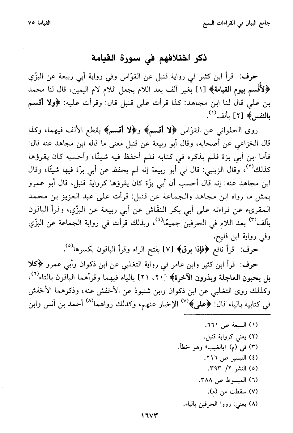 قرأ ابن كثير في رواية قنبل عن القوّاس وفي رواية أبي ربيعة عن البزّي لأقسم بيوم القيامة [1] بغير ألف بعد اللام يجعل اللام لام اليمين، قال لنا محمد بن علي قال لنا ابن مجاهد: كذا قرأت على قنبل قال: وقرأت عليه: ولا أقسم بالنفس [2] بألف «1».