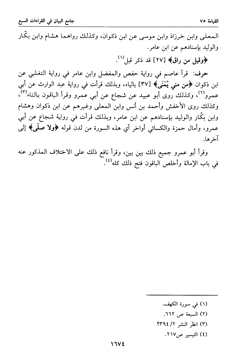 قرأ عاصم في رواية حفص والمفضل وابن عامر في رواية التغلبي عن ابن ذكوان من مني يمنى [37] بالياء، وبذلك قرأت في رواية عبد الوارث عن أبي عمرو «2»، وكذلك روى أبو عبيد عن شجاع عن أبي عمرو وقرأ الباقون بالتاء «3»، وكذلك روى الأخفش وأحمد بن أنس وابن المعلى وغيرهم عن ابن ذكوان وهشام وابن بكّار والوليد بإسنادهم عن ابن عامر، وبذلك قرأت في رواية شجاع عن أبي عمرو، وأمال حمزة والكسائي أواخر آي هذه السورة من لدن قوله ولا صلّى إلى آخرها.