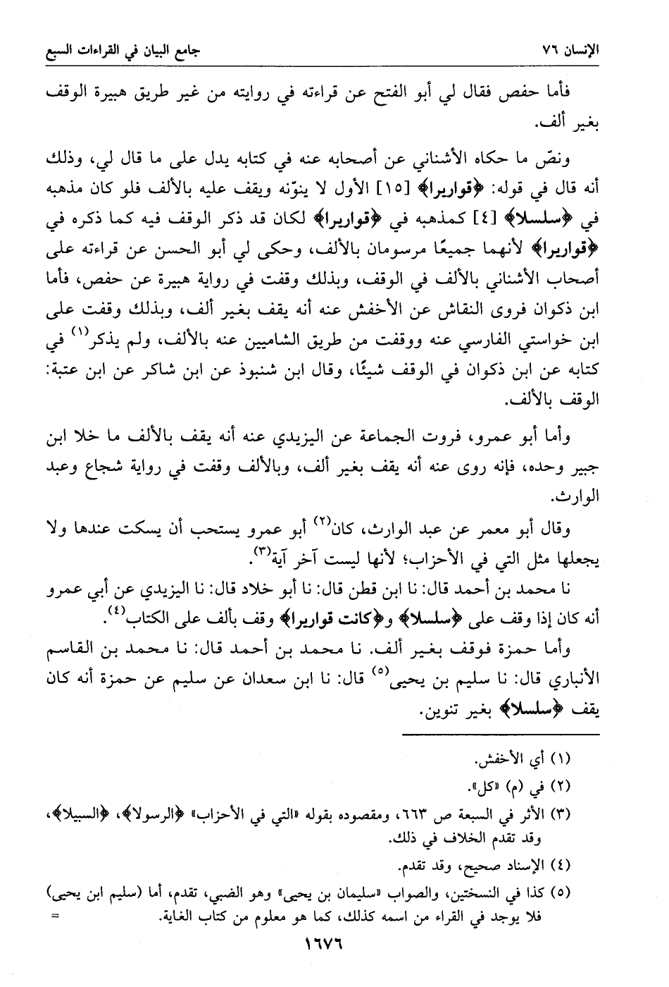 نا محمد بن أحمد قال: نا ابن قطن قال: نا أبو خلاد قال: نا اليزيدي عن أبي عمرو أنه كان إذا وقف على سلسلا وكانت قواريرا وقف بألف على الكتاب «4».