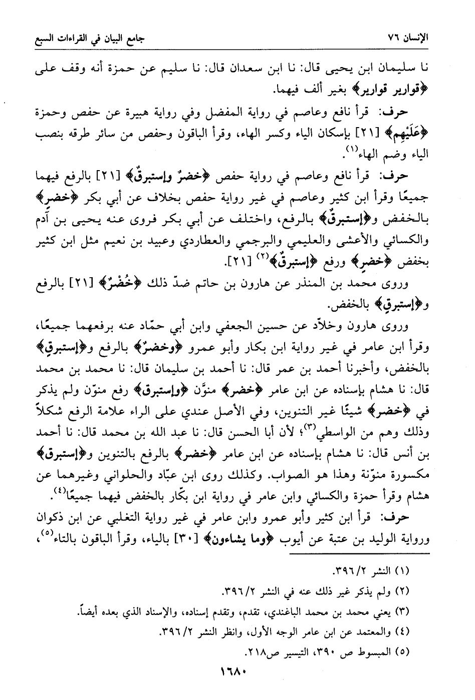 قرأ نافع وعاصم في رواية حفص خضر وإستبرق [21] بالرفع فيهما جميعا وقرأ ابن كثير وعاصم في غير رواية حفص بخلاف عن أبي بكر خضر بالخفض وإستبرق بالرفع، واختلف عن أبي بكر فروى عنه يحيى بن آدم والكسائي والأعشى والعليمي والبرجمي والعطاردي وعبيد بن نعيم مثل ابن كثير بخفض خضر ورفع إستبرق «2» [21].