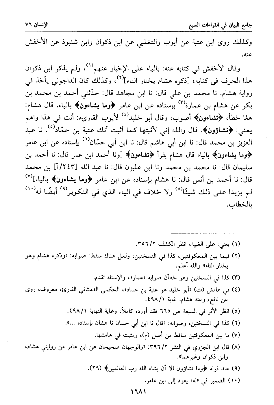 وقال الأخفش في كتابه عنه: بالياء على الإخبار عنهم «1»، ولم يذكر ابن ذكوان هذا الحرف في كتابه، [ذكره هشام يختار التاء] «2»، وكذلك كان الداجوني يأخذ في رواية هشام. نا محمد بن علي قال: نا ابن مجاهد قال: حدّثني أحمد بن محمد بن بكر عن هشام بن عمارة «3» بإسناده عن ابن عامر وما يشاءون بالياء. قال هشام: