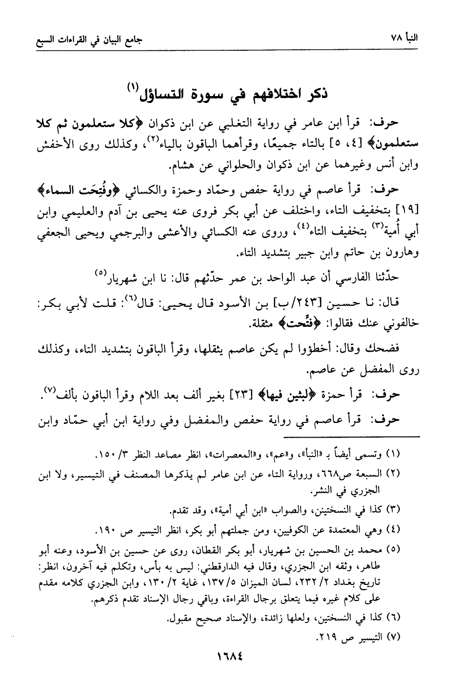 (5) محمد بن الحسين بن شهريار، أبو بكر القطان، روى عن حسين بن الأسود، وعنه أبو طاهر، وثقه ابن الجزري، وقال فيه الدارقطني: ليس به بأس، وتكلم فيه آخرون، انظر: