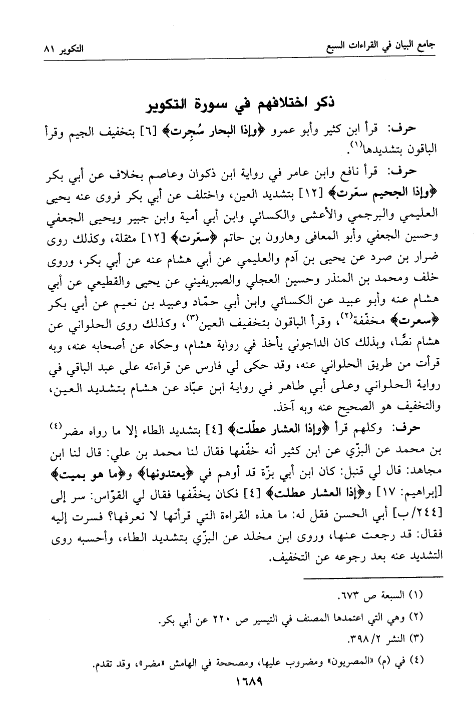 قرأ نافع وابن عامر في رواية ابن ذكوان وعاصم بخلاف عن أبي بكر وإذا الجحيم سعّرت [12] بتشديد العين، واختلف عن أبي بكر فروى عنه يحيى العليمي والبرجمي والأعشى والكسائي وابن أبي أمية وابن جبير ويحيى الجعفي وحسين الجعفي وأبو المعافى وهارون بن حاتم سعّرت [12] مثقلة، وكذلك روى ضرار بن صرد عن يحيى بن آدم والعليمي عن أبي هشام عنه عن أبي بكر، وروى خلف ومحمد بن المنذر وحسين العجلي والصيريفيني عن يحيى والقطيعي عن أبي هشام عنه وأبو عبيد عن الكسائي وابن أبي حمّاد وعبيد بن نعيم عن أبي بكر سعرت مخفّفة «2»، وقرأ الباقون بتخفيف العين «3»، وكذلك روى الحلواني عن هشام نصّا، وبذلك كان الداجوني يأخذ في رواية هشام، وحكاه عن أصحابه عنه، وبه قرأت من طريق الحلواني عنه، وقد حكى لي فارس عن قراءته على عبد الباقي في رواية الحلواني وعلى أبي طاهر في رواية ابن عبّاد عن هشام بتشديد العين، والتخفيف هو الصحيح عنه وبه آخذ.