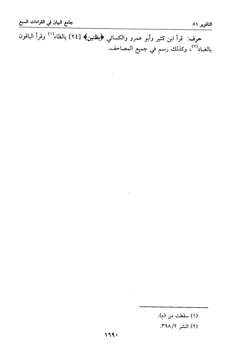 قرأ ابن كثير وأبو عمرو والكسائي بظنين [24] بالظاء «1» وقرأ الباقون بالضاد «2»، وكذلك رسم في جميع المصاحف.