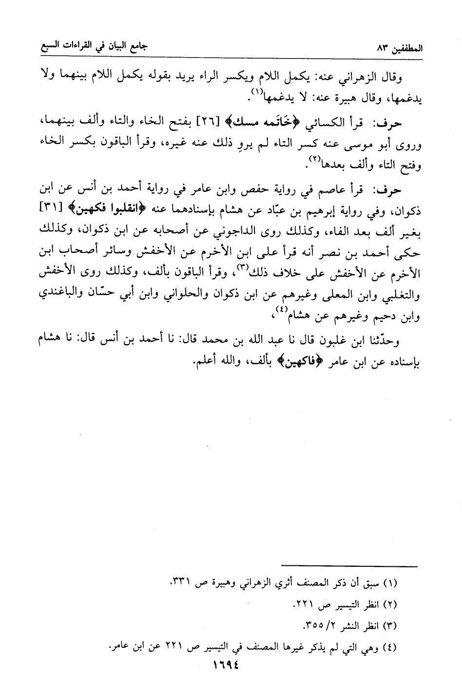 قرأ عاصم في رواية حفص وابن عامر في رواية أحمد بن أنس عن ابن ذكوان، وفي رواية إبراهيم بن عبّاد عن هشام بإسنادهما عنه انقلبوا فكهين [31] بغير ألف بعد الفاء، وكذلك روى الداجوني عن أصحابه عن ابن ذكوان، وكذلك حكى أحمد بن نصر أنه قرأ على ابن الأخرم عن الأخفش وسائر أصحاب ابن الأخرم عن الأخفش على خلاف ذلك «3»، وقرأ الباقون بألف، وكذلك روى الأخفش والتغلبي وابن المعلى وغيرهم عن ابن ذكوان والحلواني وابن أبي حسّان والباغندي وابن دحيم وغيرهم عن هشام «4»،
