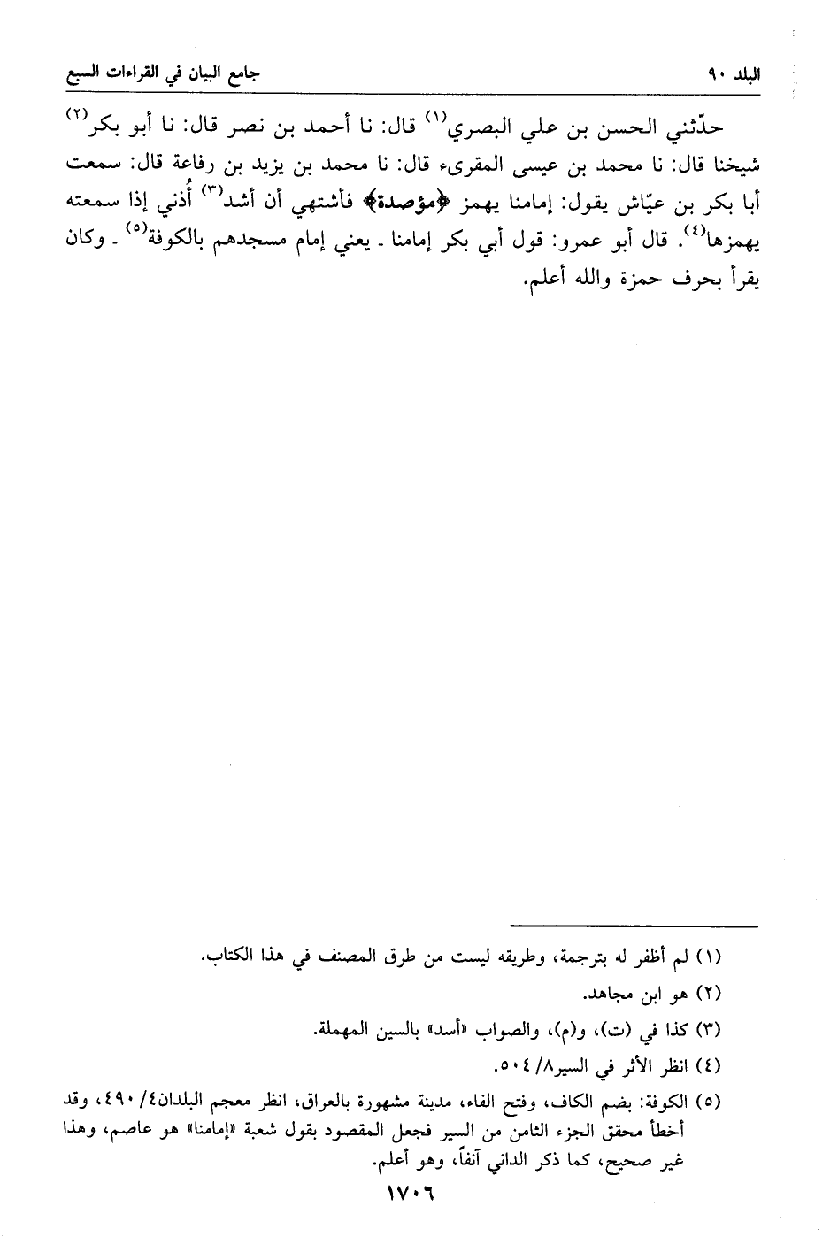 (5) الكوفة: بضم الكاف، وفتح الفاء، مدينة مشهورة بالعراق، انظر معجم البلدان 4/ 490، وقد أخطأ محقق الجزء الثامن من السير فجعل المقصود بقول شعبة «إمامنا» هو عاصم، وهذا غير صحيح، كما ذكر الداني آنفا، وهو أعلم.