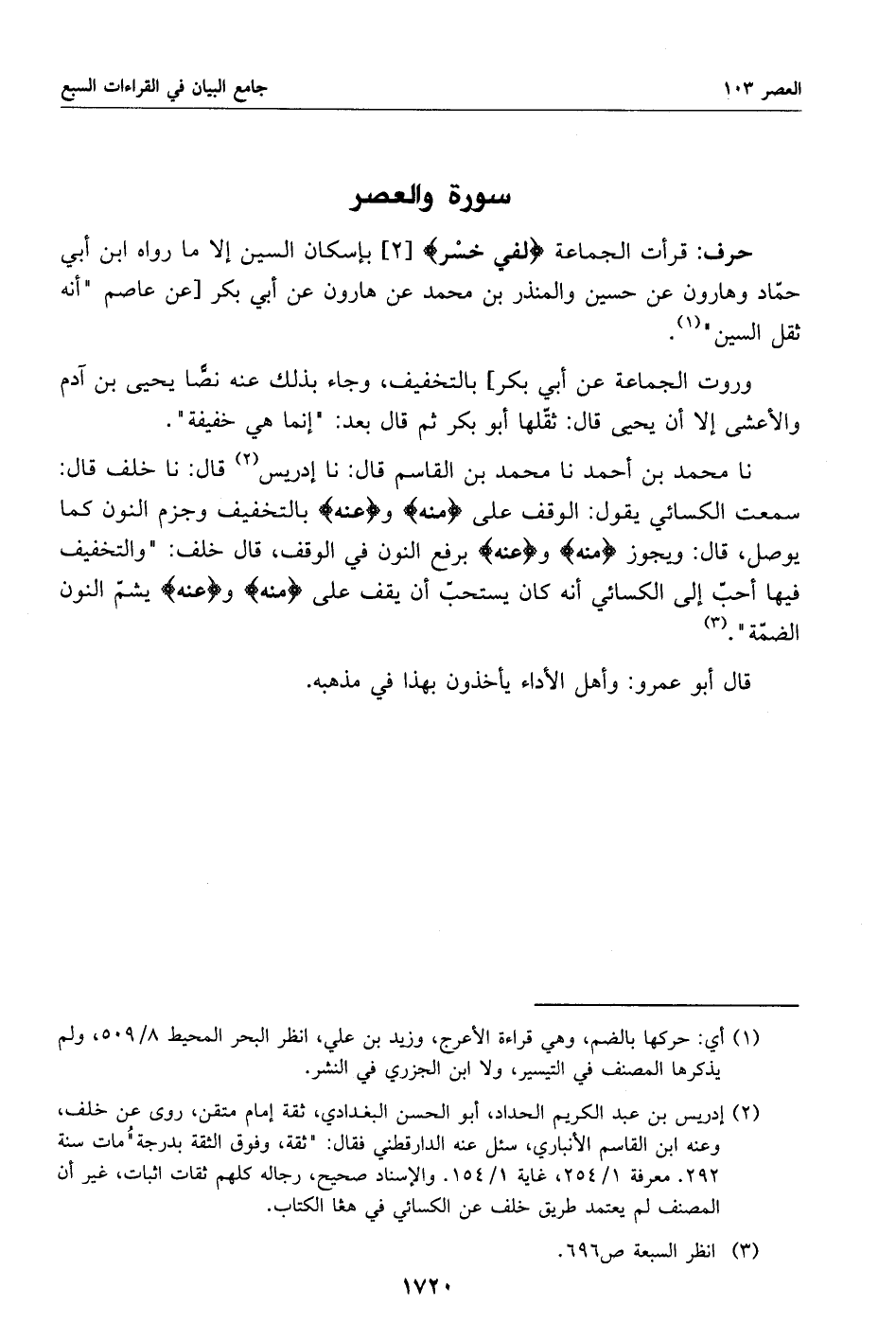 قرأت الجماعة لفي خسر [2] بإسكان السين إلا ما رواه ابن أبي حمّاد وهارون عن حسين والمنذر بن محمد عن هارون عن أبي بكر [عن عاصم" أنه ثقل السين" «1».