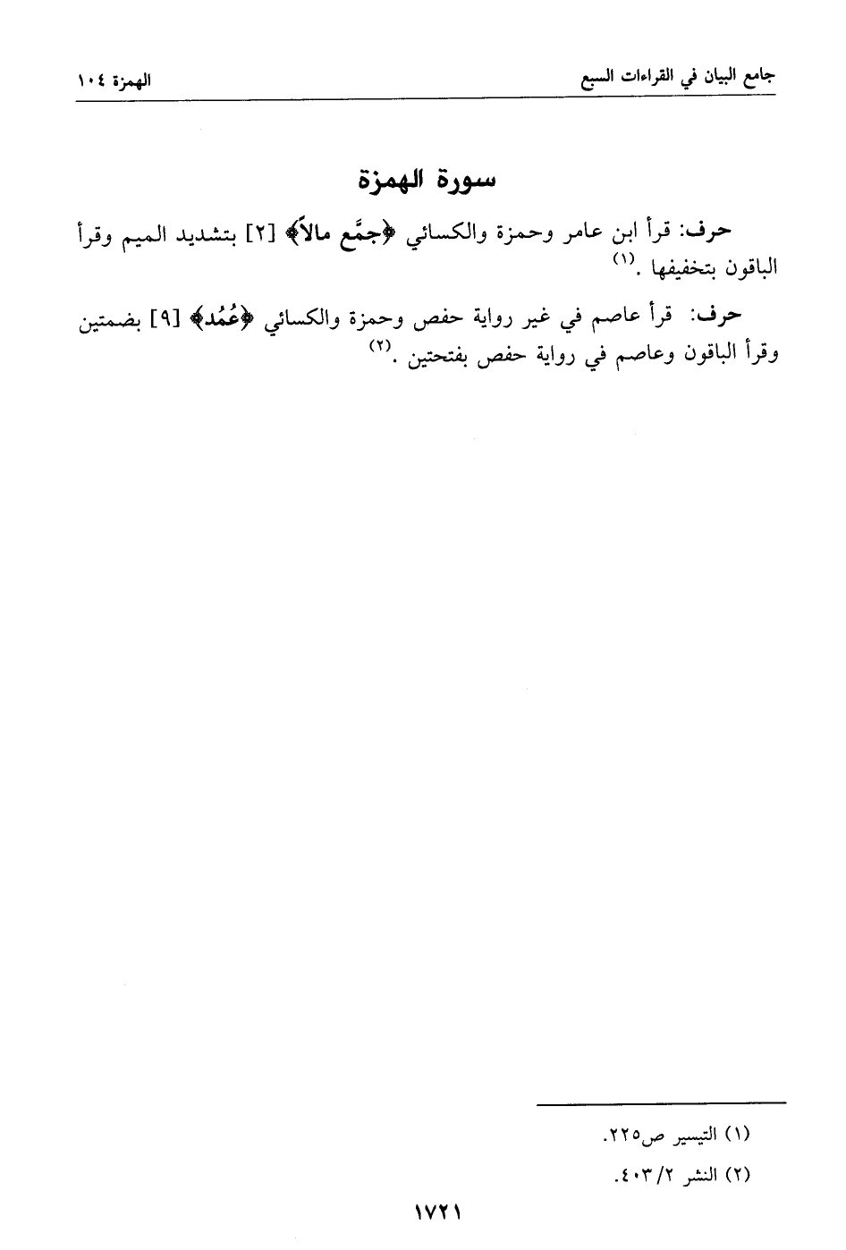 قرأ ابن عامر وحمزة والكسائي جمّع مالا [2] بتشديد الميم وقرأ الباقون بتخفيفها. «1»