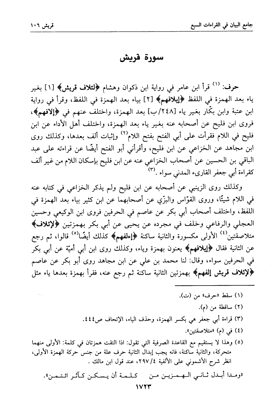 «1» قرأ ابن عامر في رواية ابن ذكوان وهشام لئلاف قريش [1] بغير ياء بعد الهمزة في اللفظ إيلافهم [2] بياء بعد الهمزة في اللفظ، وقرأ في رواية ابن عتبة وابن بكّار بغير ياء [248/ ب] بعد الهمزة، واختلف عنهم في إلافهم، فروى ابن فليح عن أصحابه عنه بغير ياء بعد الهمزة، واختلف أهل الأداء عن ابن فليح في اللام فقرأت على أبي الفتح بفتح اللام «2» وإثبات ألف بعدها، وكذلك روى ابن مجاهد عن الخزاعي عن ابن فليح، وأقرأني أبو الفتح أيضا عن قراءته على عبد الباقي بن الحسين عن أصحاب الخزاعي عنه عن ابن فليح بإسكان اللام من غير ألف كقراءة أبي جعفر القارئ المدني سواء. «3»