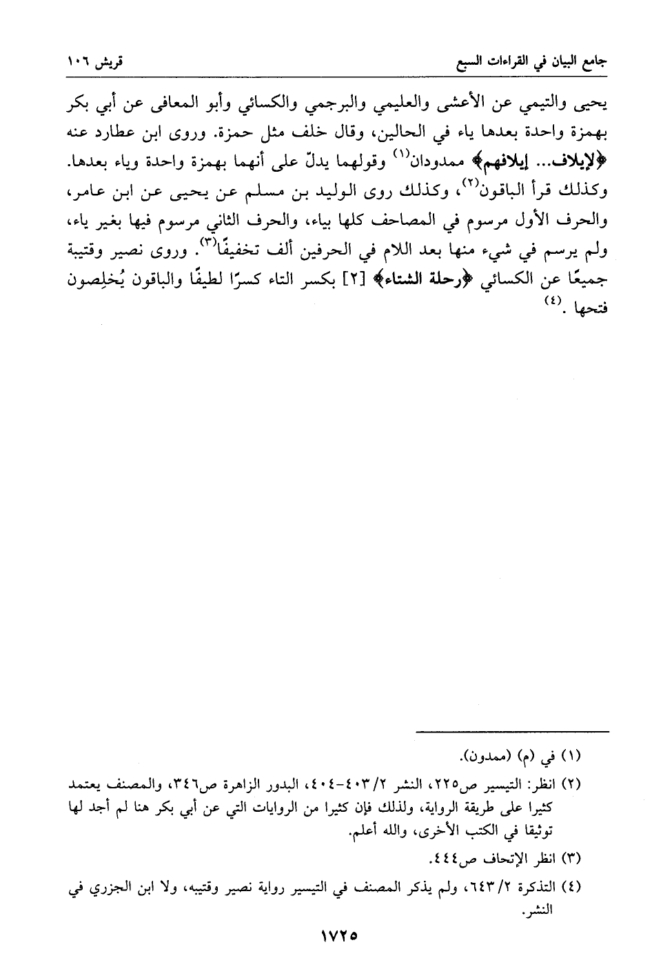 وكذلك قرأ الباقون «2»، وكذلك روى الوليد بن مسلم عن يحيى عن ابن عامر، والحرف الأول مرسوم في المصاحف كلها بياء، والحرف الثاني مرسوم فيها بغير ياء، ولم يرسم في شيء منها بعد اللام في الحرفين ألف تخفيفا «3». وروى نصير وقتيبة جميعا عن الكسائي رحلة الشتاء [2] بكسر التاء كسرا لطيفا والباقون يخلصون فتحها. «4»