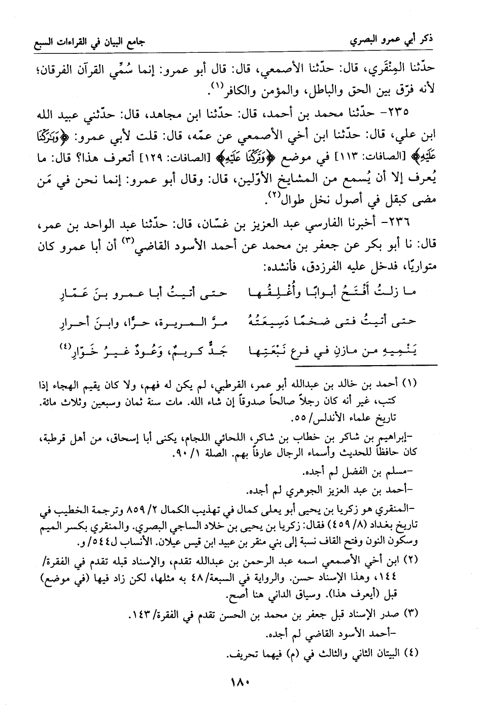 235 - حدّثنا محمد بن أحمد، قال: حدّثنا ابن مجاهد، قال: حدّثني عبيد الله ابن علي، قال: حدّثنا ابن أخي الأصمعي عن عمّه، قال: قلت لأبي عمرو: وبركنا عليه [الصافات: 113] في موضع وتركنا عليه [الصافات: 129] أتعرف هذا؟ قال: ما يعرف إلا أن يسمع من المشايخ الأوّلين، قال: وقال أبو عمرو: إنما نحن في من مضى كبقل في أصول نخل طوال «2».