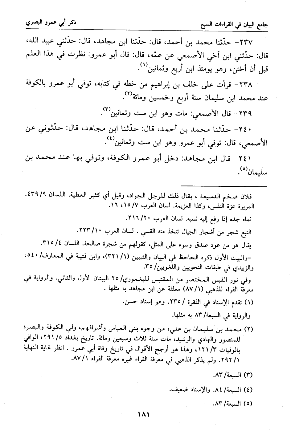240 - حدّثنا محمد بن أحمد، قال: حدّثنا ابن مجاهد، قال: حدّثوني عن الأصمعي، قال: توفي أبو عمرو وهو ابن ست وثمانين «4».