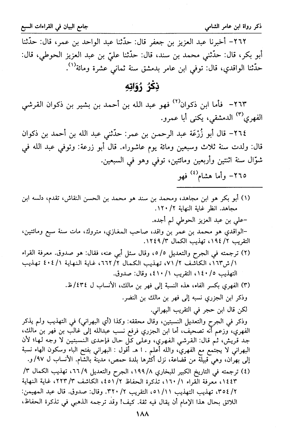 263 - فأما ابن ذكوان «2» فهو عبد الله بن أحمد بن بشير بن ذكوان القرشي الفهري «3» الدمشقي، يكنى أبا عمرو.