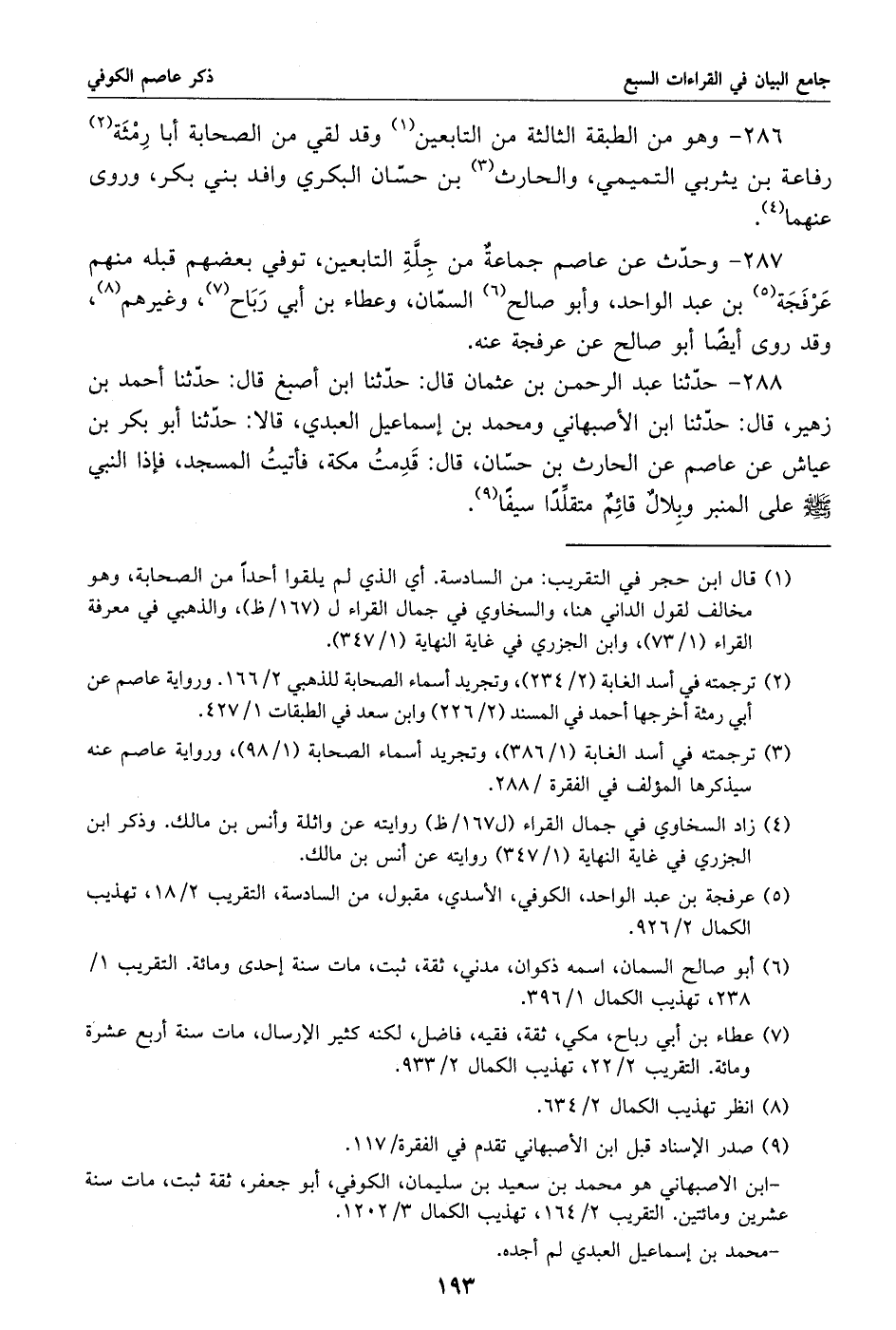 (1) قال ابن حجر في التقريب: من السادسة. أي الذي لم يلقوا أحدا من الصحابة، وهو مخالف لقول الداني هنا، والسخاوي في جمال القراء ل (167/ ظ)، والذهبي في معرفة القراء (1/ 73)، وابن الجزري في غاية النهاية (1/ 347).