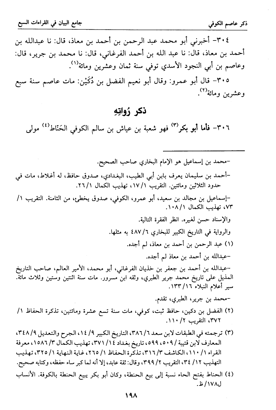 306 - فأما أبو بكر «3» فهو شعبة بن عياش بن سالم الكوفي الحنّاط «4» مولى