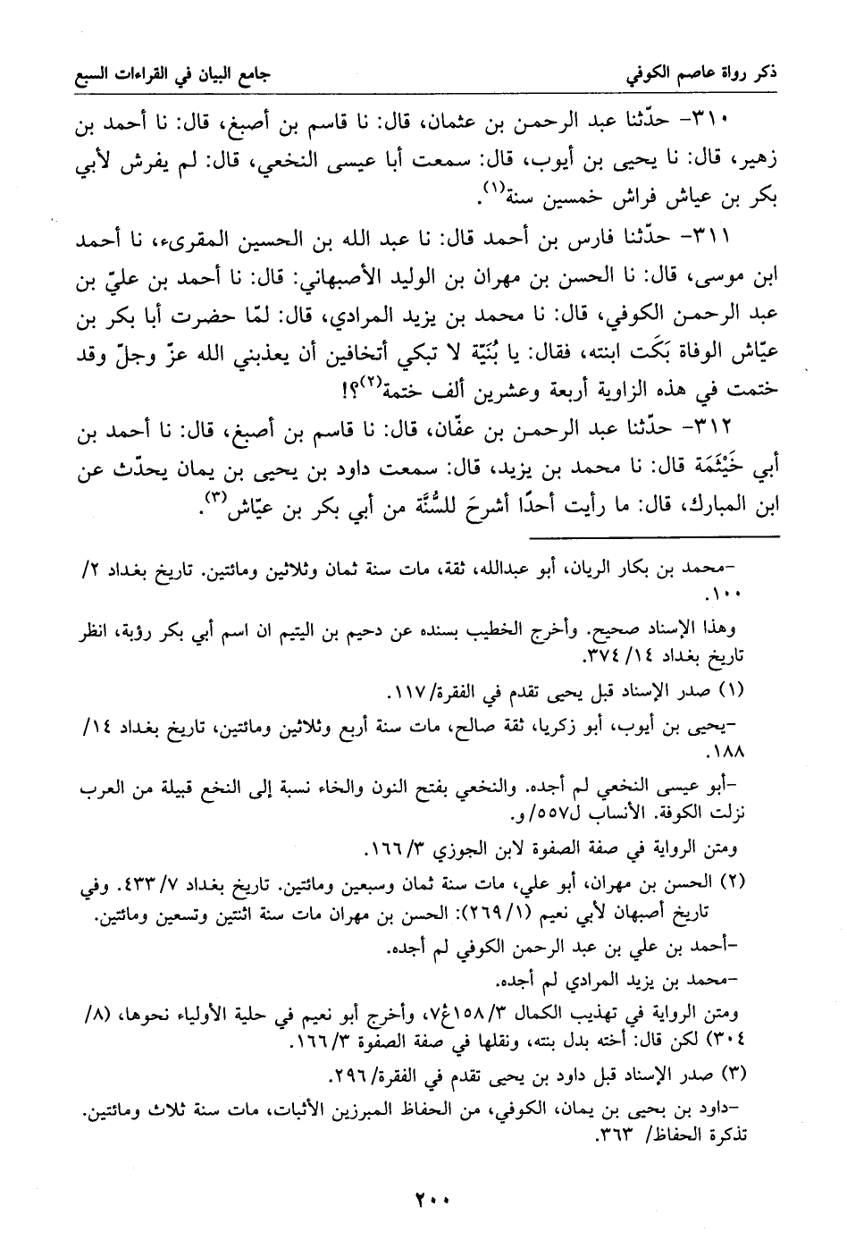 312 - حدّثنا عبد الرحمن بن عفّان، قال: نا قاسم بن أصبغ، قال: نا أحمد بن أبي خيثمة قال: نا محمد بن يزيد، قال: سمعت داود بن يحيى بن يمان يحدّث عن ابن المبارك، قال: ما رأيت أحدا أشرح للسّنّة من أبي بكر بن عيّاش «3».