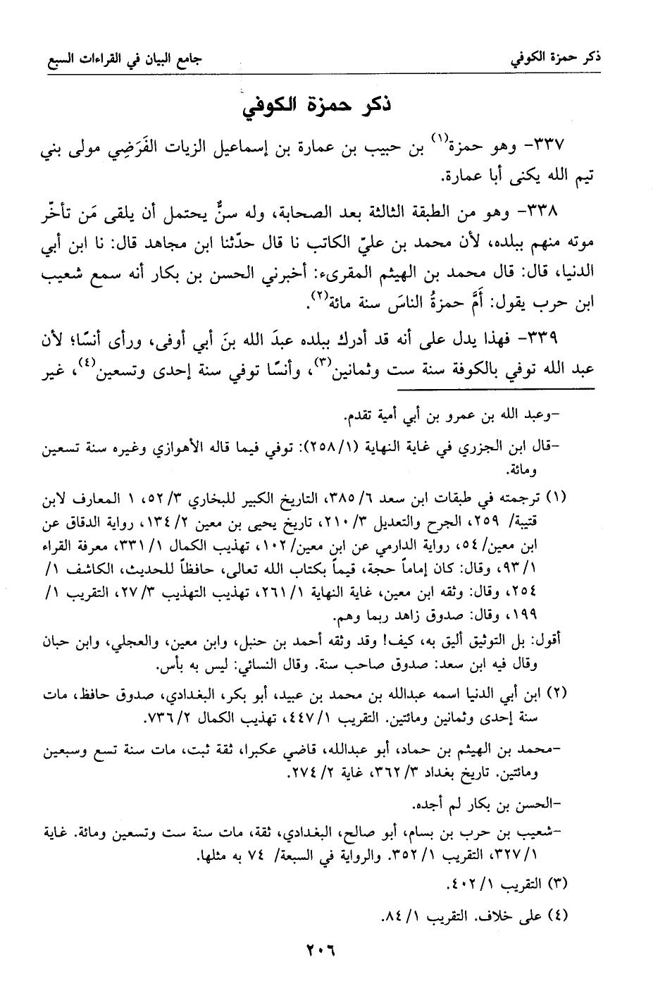 338 - وهو من الطبقة الثالثة بعد الصحابة، وله سنّ يحتمل أن يلقى من تأخّر موته منهم ببلده، لأن محمد بن عليّ الكاتب نا قال حدّثنا ابن مجاهد قال: نا ابن أبي الدنيا، قال: قال محمد بن الهيثم المقرئ: أخبرني الحسن بن بكار أنه سمع شعيب ابن حرب يقول: أمّ حمزة الناس سنة مائة «2».