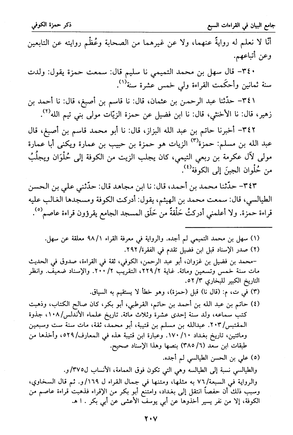 343 - حدّثنا محمد بن أحمد، قال: نا ابن مجاهد قال: حدّثني علي بن الحسن الطيالسي، قال: سمعت محمد بن الهيثم، يقول: أدركت الكوفة ومسجدها الغالب عليه قراءة حمزة. ولا أعلمني أدركت حلقة من حلق المسجد الجامع يقرءون قراءة عاصم «5».