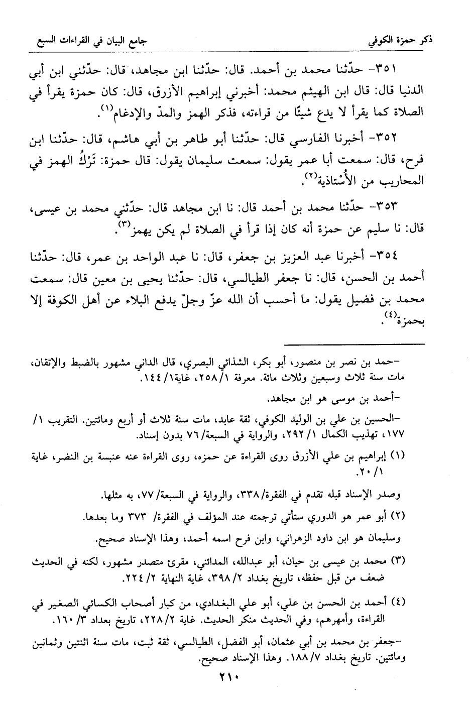 351 - حدّثنا محمد بن أحمد. قال: حدّثنا ابن مجاهد، قال: حدّثني ابن أبي الدنيا قال: قال ابن الهيثم محمد: أخبرني إبراهيم الأزرق، قال: كان حمزة يقرأ في الصلاة كما يقرأ لا يدع شيئا من قراءته، فذكر الهمز والمدّ والإدغام «1».