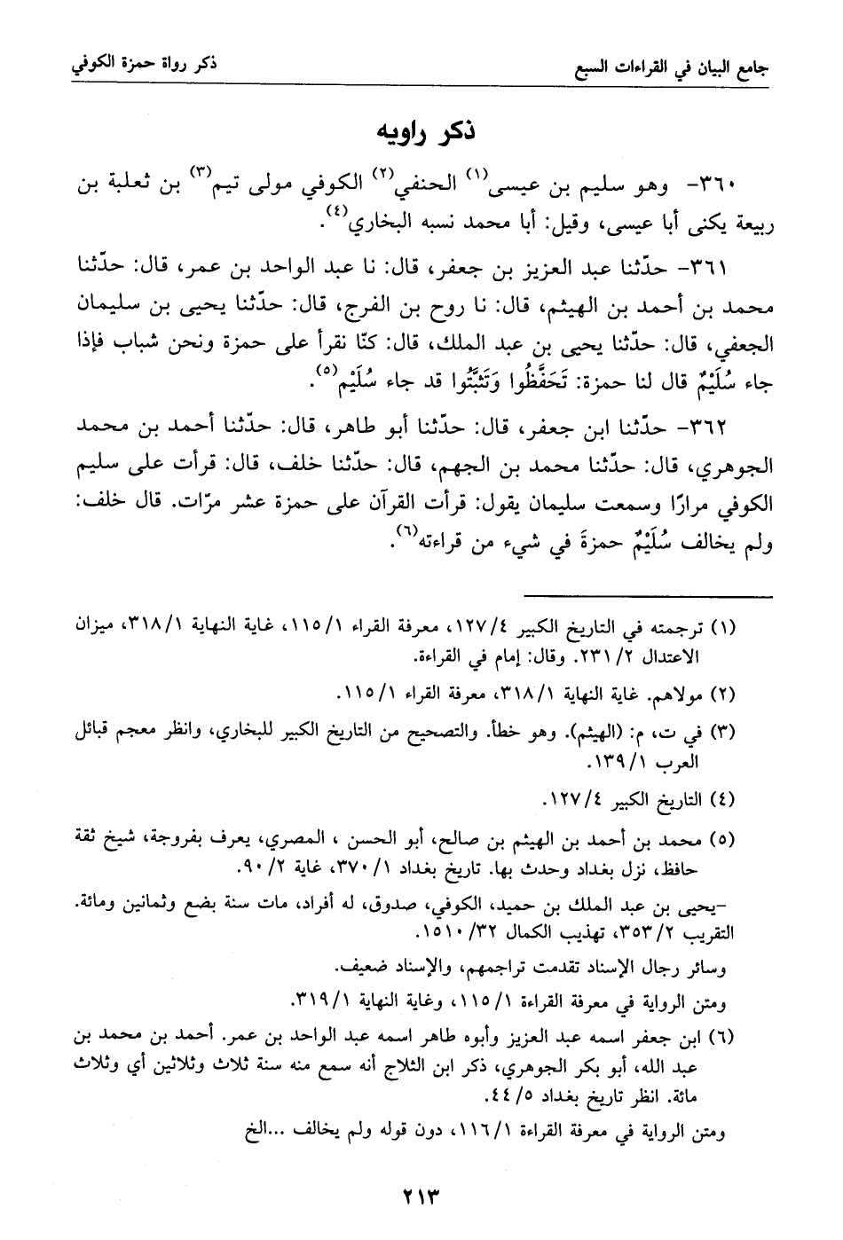 362 - حدّثنا ابن جعفر، قال: حدّثنا أبو طاهر، قال: حدّثنا أحمد بن محمد الجوهري، قال: حدّثنا محمد بن الجهم، قال: حدّثنا خلف، قال: قرأت على سليم الكوفي مرارا وسمعت سليمان يقول: قرأت القرآن على حمزة عشر مرّات. قال خلف: