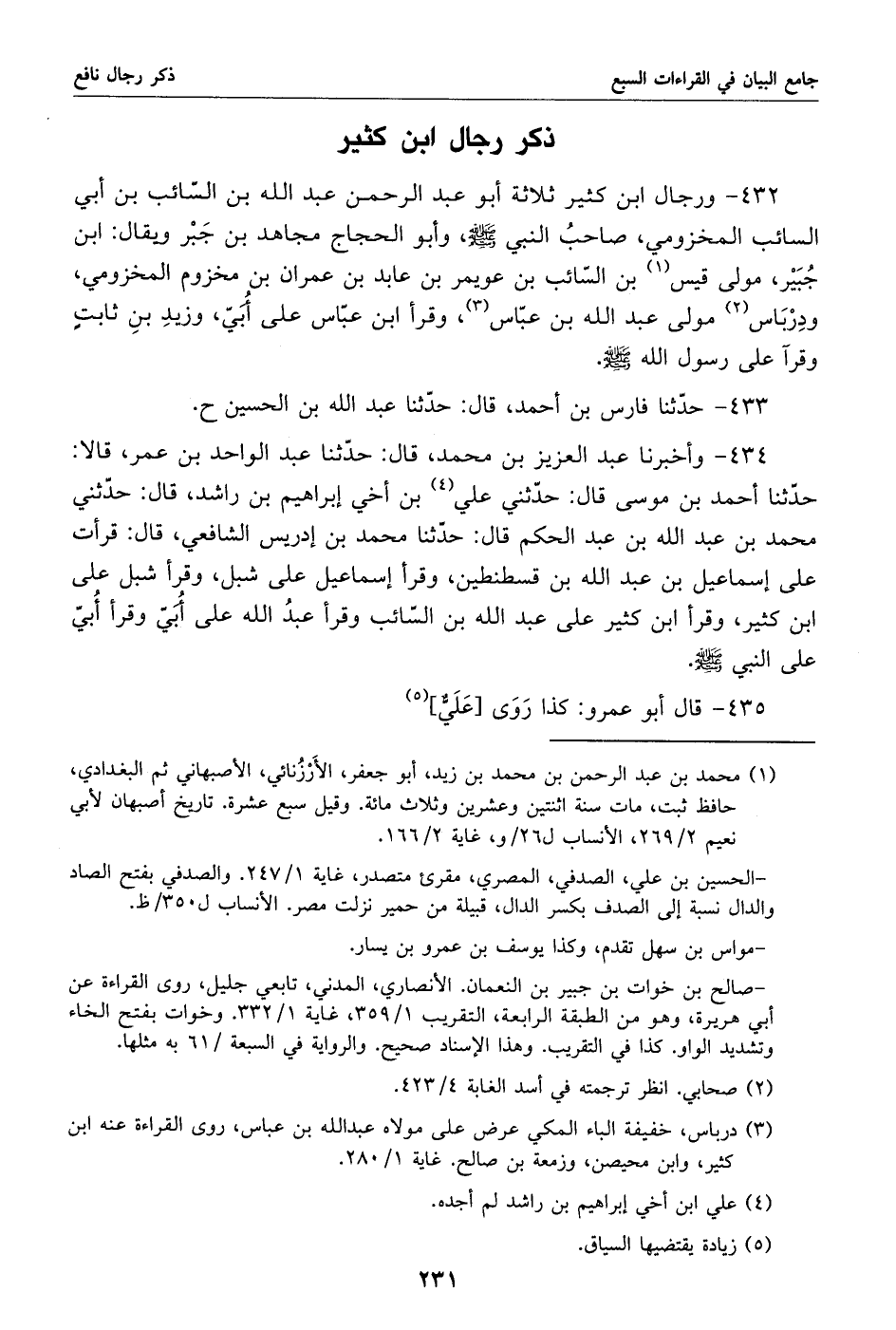 432 - ورجال ابن كثير ثلاثة أبو عبد الرحمن عبد الله بن السّائب بن أبي السائب المخزومي، صاحب النبي صلى الله عليه وسلم، وأبو الحجاج مجاهد بن جبر ويقال: ابن جبير، مولى قيس «1» بن السّائب بن عويمر بن عابد بن عمران بن مخزوم المخزومي، ودرباس «2» مولى عبد الله بن عبّاس «3»، وقرأ ابن عبّاس على أبيّ، وزيد بن ثابت وقرآ على رسول الله صلى الله عليه وسلم.