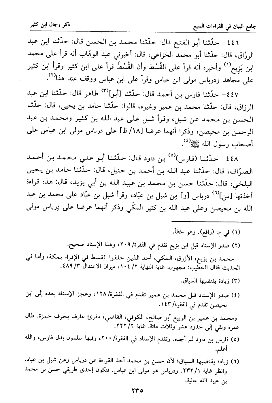 448 - حدّثنا (فارس) «5» بن داود قال: حدّثنا أبو علي محمد بن أحمد الصوّاف، قال: حدّثنا عبد الله بن أحمد بن حنبل، قال: حدّثنا حامد بن يحيى البلخي، قال: حدّثنا حسن بن محمد بن عبيد الله بن أبي يزيد، قال: هذه قراءة أخذتها [من] «6» درباس [و] من شبل بن عبّاد، وقرأ شبل بن عبّاد على محمد بن عبد الله بن محيصن وعلى عبد الله بن كثير المكّي وذكر أنهما عرضا على درباس مولى