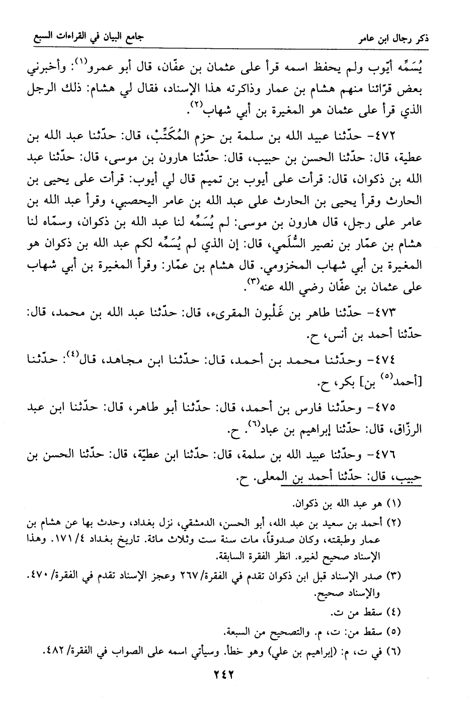 472 - حدّثنا عبيد الله بن سلمة بن حزم المكتّب، قال: حدّثنا عبد الله بن عطية، قال: حدّثنا الحسن بن حبيب، قال: حدّثنا هارون بن موسى، قال: حدّثنا عبد الله بن ذكوان، قال: قرأت على أيوب بن تميم قال لي أيوب: قرأت على يحيى بن الحارث وقرأ يحيى بن الحارث على عبد الله بن عامر اليحصبي، وقرأ عبد الله بن عامر على رجل، قال هارون بن موسى: لم يسمّه لنا عبد الله بن ذكوان، وسمّاه لنا هشام بن عمّار بن نصير السّلمي، قال: إن الذي لم يسمّه لكم عبد الله بن ذكوان هو المغيرة بن أبي شهاب المخزومي. قال هشام بن عمّار: وقرأ المغيرة بن أبي شهاب على عثمان بن عفّان رضي الله عنه «3».