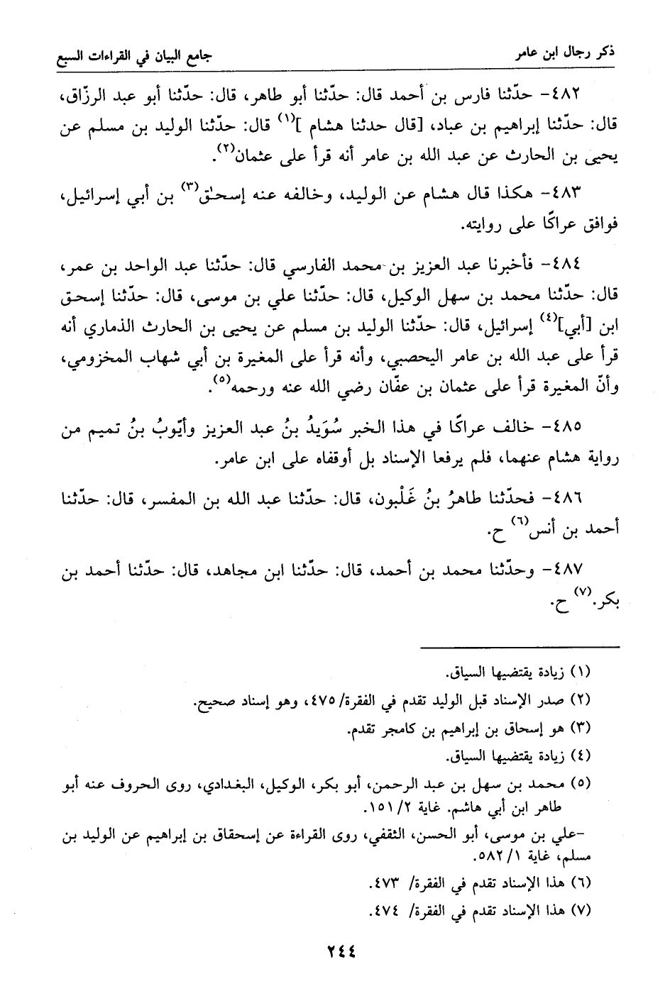 484 - فأخبرنا عبد العزيز بن محمد الفارسي قال: حدّثنا عبد الواحد بن عمر، قال: حدّثنا محمد بن سهل الوكيل، قال: حدّثنا علي بن موسى، قال: حدّثنا إسحاق ابن [أبي] «4» إسرائيل، قال: حدّثنا الوليد بن مسلم عن يحيى بن الحارث الذماري أنه قرأ على عبد الله بن عامر اليحصبي، وأنه قرأ على المغيرة بن أبي شهاب المخزومي، وأنّ المغيرة قرأ على عثمان بن عفّان رضي الله عنه ورحمه «5».