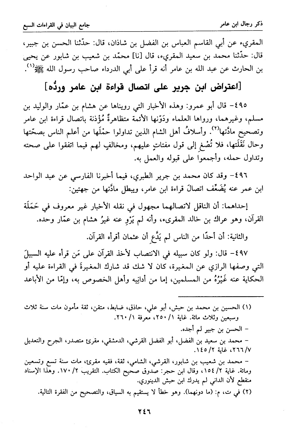 496 - وقد كان محمد بن جرير الطبري، فيما أخبرنا الفارسي عن عبد الواحد ابن عمر عنه يضعّف اتصال قراءة ابن عامر، ويبطل مادّتها من جهتين: