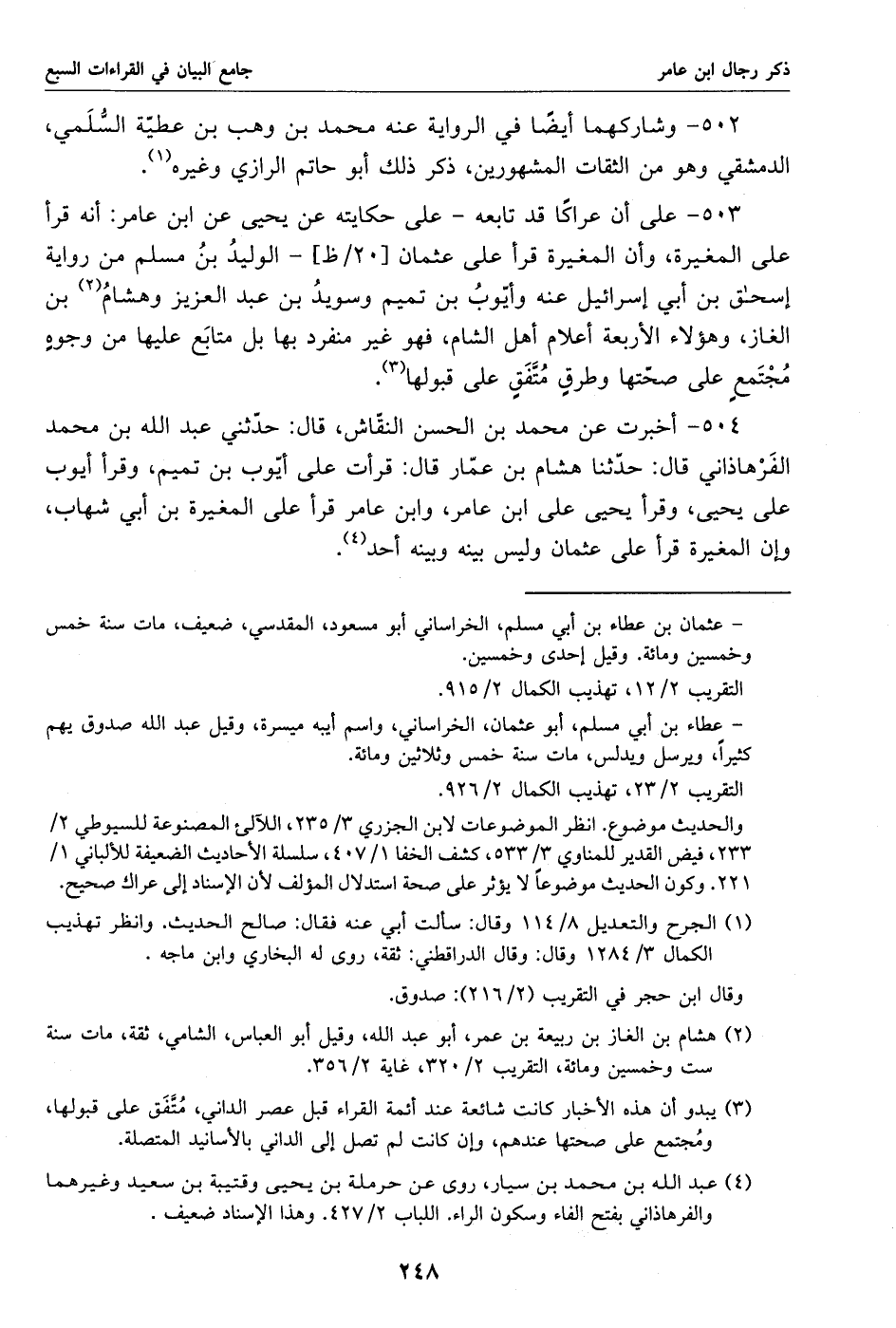 504 - أخبرت عن محمد بن الحسن النقّاش، قال: حدّثني عبد الله بن محمد الفرهاذاني قال: حدّثنا هشام بن عمّار قال: قرأت على أيّوب بن تميم، وقرأ أيوب على يحيى، وقرأ يحيى على ابن عامر، وابن عامر قرأ على المغيرة بن أبي شهاب، وإن المغيرة قرأ على عثمان وليس بينه وبينه أحد «4».