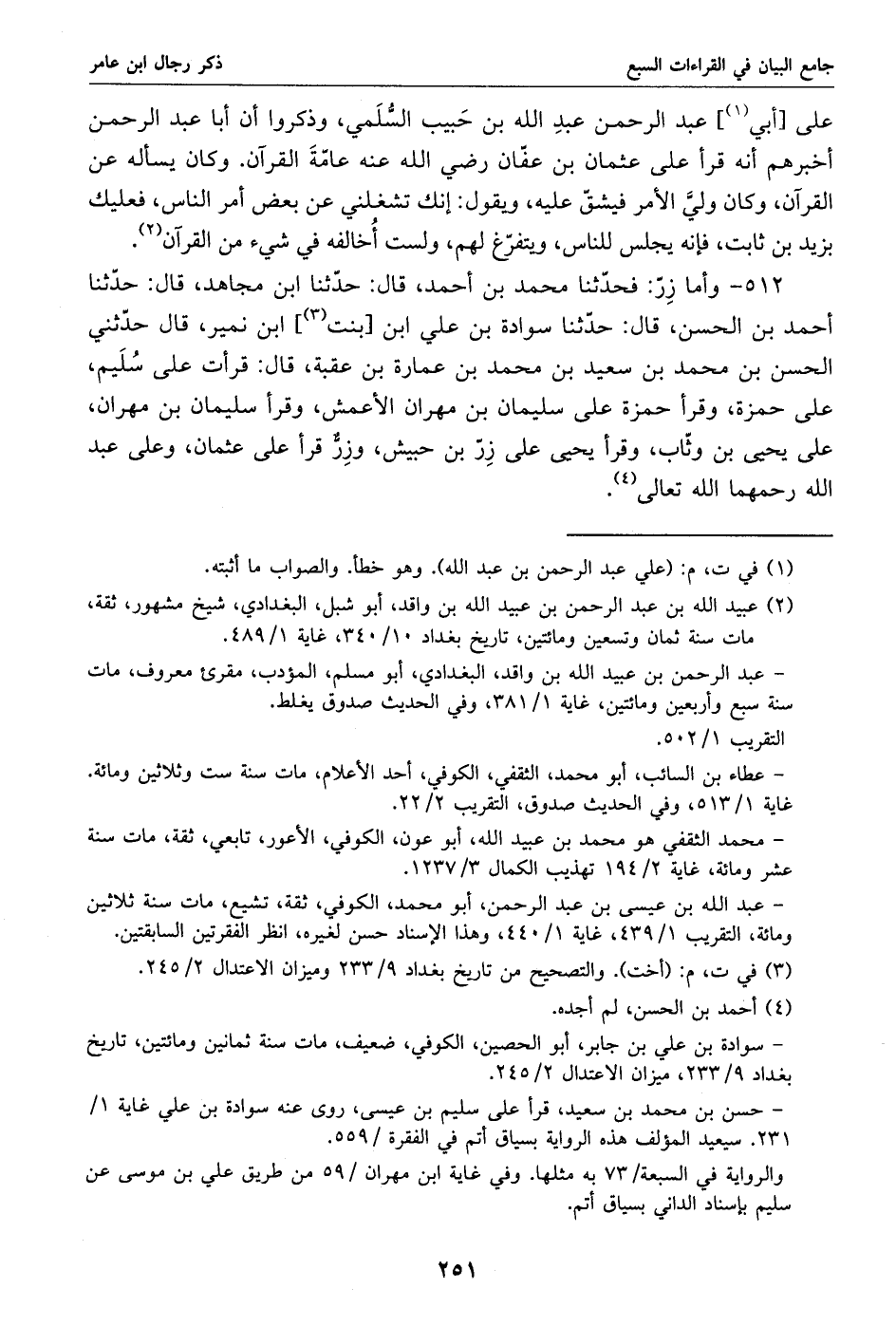 512 - وأما زرّ: فحدّثنا محمد بن أحمد، قال: حدّثنا ابن مجاهد، قال: حدّثنا أحمد بن الحسن، قال: حدّثنا سوادة بن علي ابن [بنت «3»] ابن نمير، قال حدّثني الحسن بن محمد بن سعيد بن محمد بن عمارة بن عقبة، قال: قرأت على سليم، على حمزة، وقرأ حمزة على سليمان بن مهران الأعمش، وقرأ سليمان بن مهران، على يحيى بن وثّاب، وقرأ