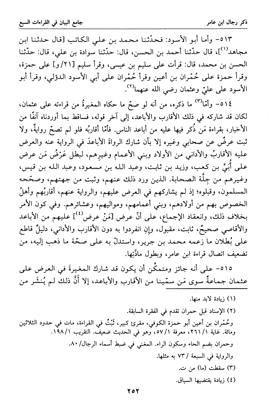 514 - وأمّا «3» ما ذكره، من أنه لو صحّ ما حكاه المغيرة من قراءته على عثمان، لكان قد شاركه في ذلك الأقارب والأباعد، إلى آخر قوله، فساقط بما أوردناه آنفا من الأخبار، بقراءة من ذكر فيها عليه من أباعد الناس. فأمّا أقاربه فلو لم تصحّ رواية، ولا ثبت عرض عن صحابي وغيره إلا بأن شارك الرواة الأباعد في الرواية عنه والعرض عليه الأقارب والأداني من الأولاد وبني الأعمام وغيرهم، لبطل عرض من عرض على أبيّ بن كعب، وزيد بن ثابت، وعبد الله بن مسعود، وعبد الله بن قيس، وغيرهم من جلّة الصحابة. الذين ورد ذلك عنهم، وثبت من جهتهم، وصحّحه المسلمون، وقبلوه؛ إذ لم يشاركهم في العرض عليهم، والرواية عنهم، أقاربهم وأهل الخصوص بهم من أولادهم، وبني أعمامهم، ومواليهم، وعشائرهم. وفي كون الأمر بخلاف ذلك، وانعقاد الإجماع، على أنّ عرض [من عرض «4»] عليهم من الأباعد والأقاصي صحيح، ثابت، مقبول، وإن انفردوا به دون الأقارب والأداني، دليل قاطع على بطلان ما زعمه محمد بن جرير، واستدلّ به على صحّة ما ذهب إليه، من تضعيف اتصال قراءة ابن عامر، وبطول مادّتها.