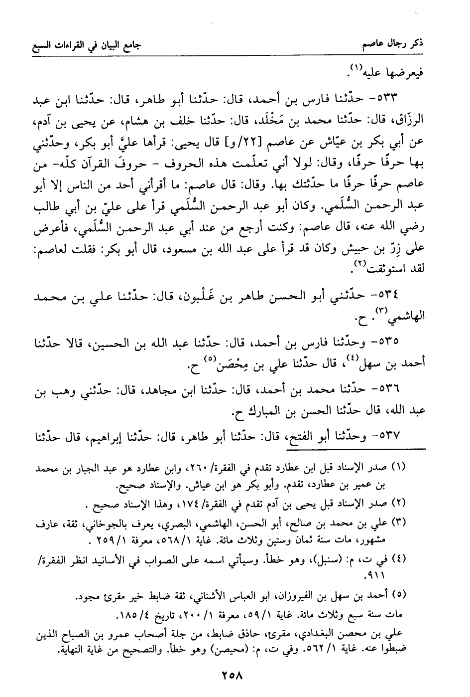 533 - حدّثنا فارس بن أحمد، قال: حدّثنا أبو طاهر، قال: حدّثنا ابن عبد الرزّاق، قال: حدّثنا محمد بن مخلد، قال: حدّثنا خلف بن هشام، عن يحيى بن آدم، عن أبي بكر بن عيّاش عن عاصم [22/ و] قال يحيى: قرأها عليّ أبو بكر، وحدّثني بها حرفا حرفا، وقال: لولا أني تعلّمت هذه الحروف- حروف القرآن كلّه- من عاصم حرفا حرفا ما حدّثتك بها. وقال: قال عاصم: ما أقرأني أحد من الناس إلا أبو عبد الرحمن السّلمي. وكان أبو عبد الرحمن السّلمي قرأ على عليّ بن أبي طالب رضي الله عنه، قال عاصم: وكنت أرجع من عند أبي عبد الرحمن السّلمي، فأعرض على زرّ بن حبيش وكان قد قرأ على عبد الله بن مسعود، قال أبو بكر: فقلت لعاصم: