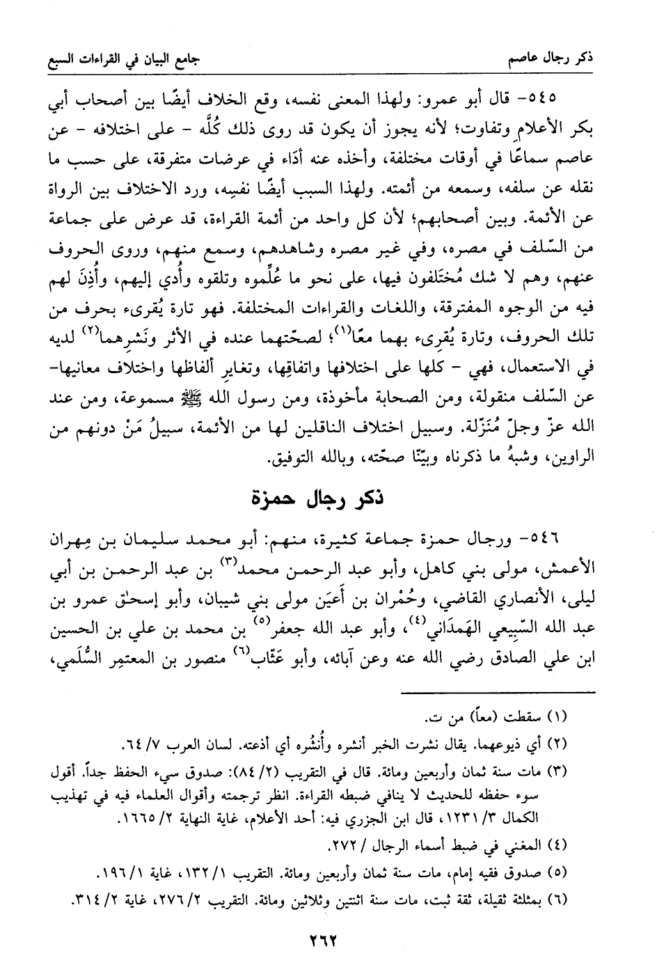 546 - ورجال حمزة جماعة كثيرة، منهم: أبو محمد سليمان بن مهران الأعمش، مولى بني كاهل، وأبو عبد الرحمن محمد «3» بن عبد الرحمن بن أبي ليلى، الأنصاري القاضي، وحمران بن أعين مولى بني شيبان، وأبو إسحاق عمرو بن عبد الله السّبيعي الهمداني «4»، وأبو عبد الله جعفر «5» بن محمد بن علي بن الحسين ابن علي الصادق رضي الله عنه وعن آبائه، وأبو عثّاب «6» منصور بن المعتمر السّلمي،