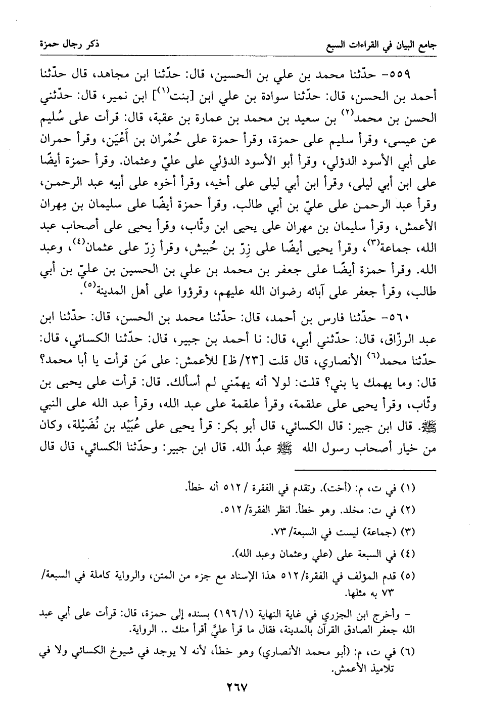 559 - حدّثنا محمد بن علي بن الحسين، قال: حدّثنا ابن مجاهد، قال حدّثنا أحمد بن الحسن، قال: حدّثنا سوادة بن علي ابن [بنت «1»] ابن نمير، قال: حدّثني الحسن بن محمد «2» بن سعيد بن محمد بن عمارة بن عقبة، قال: قرأت على سليم عن عيسى، وقرأ سليم على حمزة، وقرأ حمزة على حمران بن أعين، وقرأ حمران على أبي الأسود الدؤلي، وقرأ أبو الأسود الدؤلي على عليّ وعثمان. وقرأ حمزة أيضا على ابن أبي ليلى، وقرأ ابن أبي ليلى على أخيه، وقرأ أخوه على أبيه عبد الرحمن، وقرأ عبد الرحمن على عليّ بن أبي طالب. وقرأ حمزة أيضا على سليمان بن مهران الأعمش، وقرأ سليمان بن مهران على يحيى ابن وثّاب، وقرأ يحيى على أصحاب عبد الله، جماعة «3»، وقرأ يحيى أيضا على زرّ بن حبيش، وقرأ زرّ على عثمان «4»، وعبد الله. وقرأ حمزة أيضا على جعفر بن محمد بن علي بن الحسين بن عليّ بن أبي طالب، وقرأ جعفر على آبائه رضوان الله عليهم، وقرءوا على أهل المدينة «5».