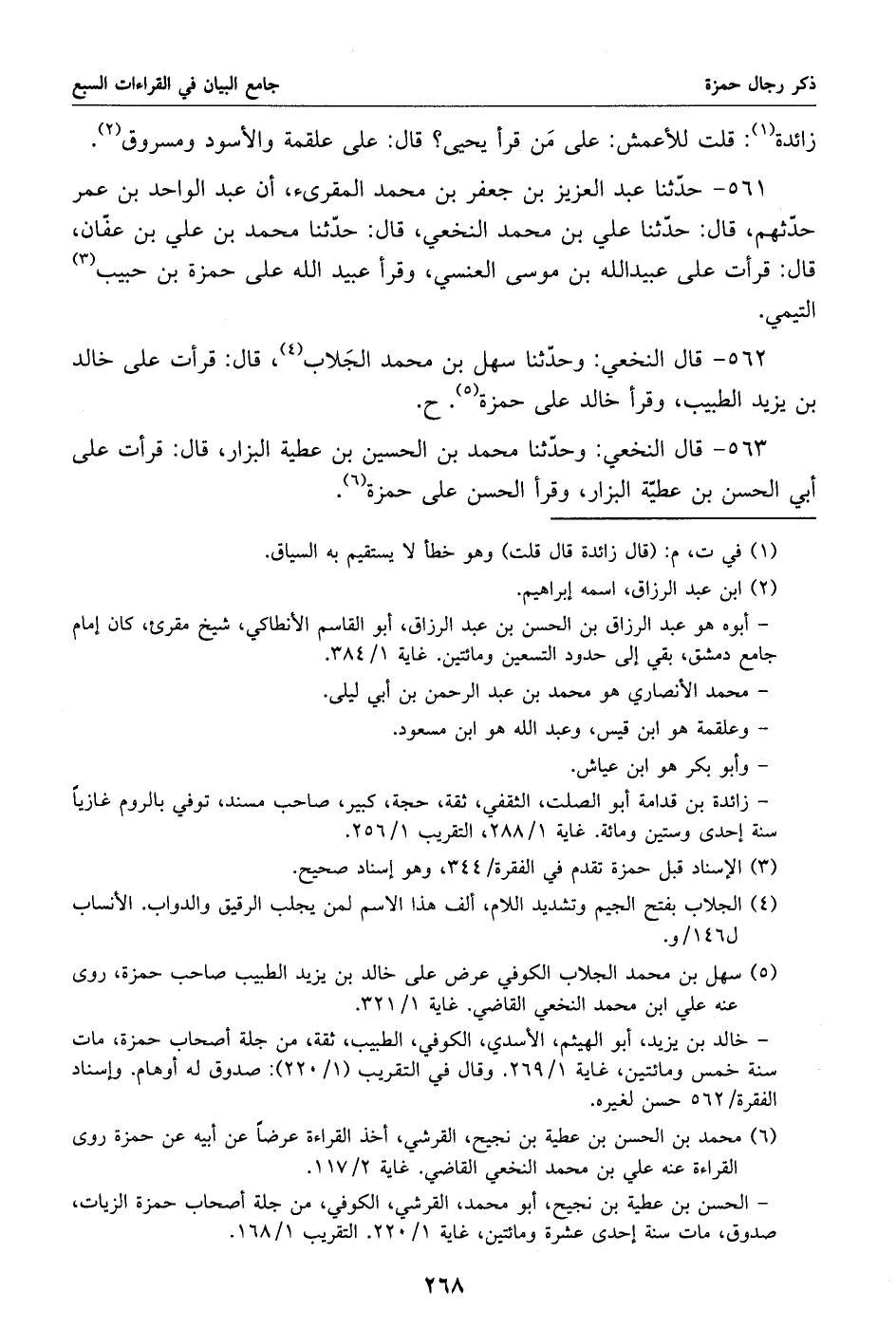 562 - قال النخعي: وحدّثنا سهل بن محمد الجلاب «4»، قال: قرأت على خالد بن يزيد الطبيب، وقرأ خالد على حمزة «5». ح.