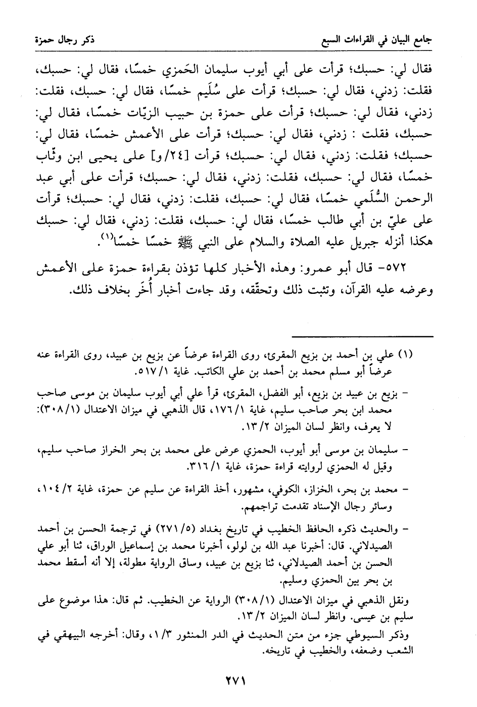 572 - قال أبو عمرو: وهذه الأخبار كلها تؤذن بقراءة حمزة على الأعمش وعرضه عليه القرآن، وتثبت ذلك وتحقّقه، وقد جاءت أخبار أخر بخلاف ذلك.