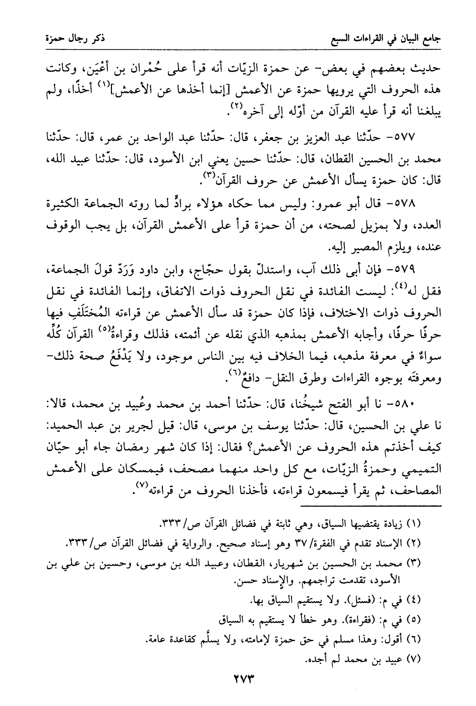 578 - قال أبو عمرو: وليس مما حكاه هؤلاء براد لما روته الجماعة الكثيرة العدد، ولا بمزيل لصحته، من أن حمزة قرأ على الأعمش القرآن، بل يجب الوقوف عنده، ويلزم المصير إليه.