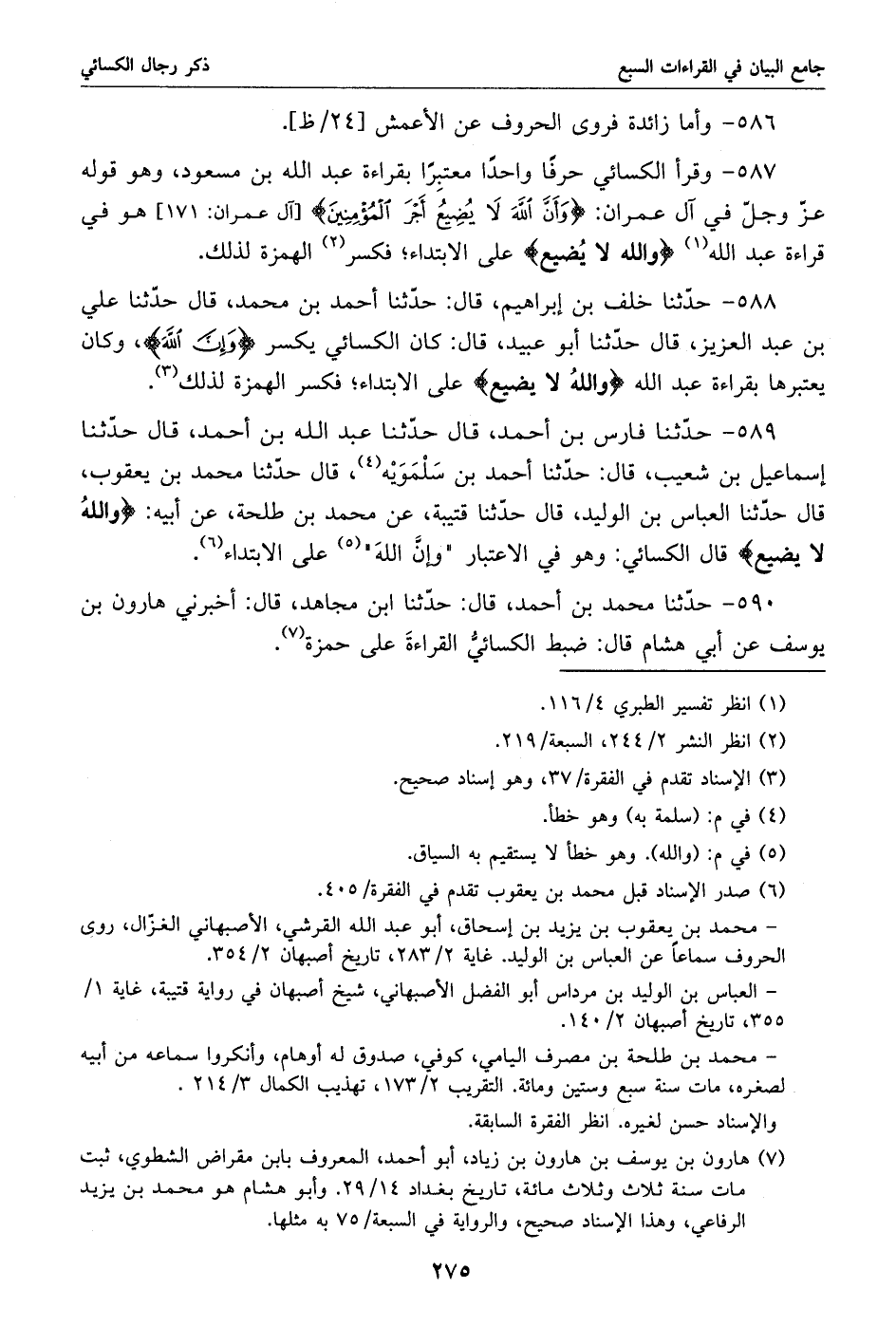 590 - حدّثنا محمد بن أحمد، قال: حدّثنا ابن مجاهد، قال: أخبرني هارون بن يوسف عن أبي هشام قال: ضبط الكسائيّ القراءة على حمزة «7».